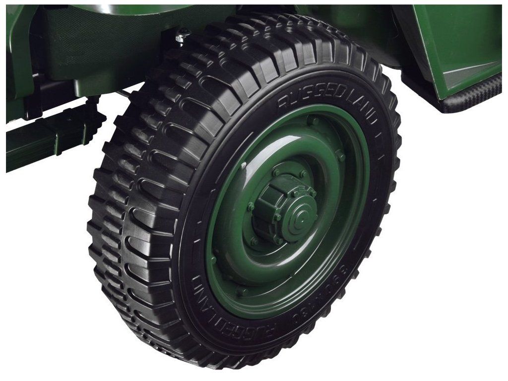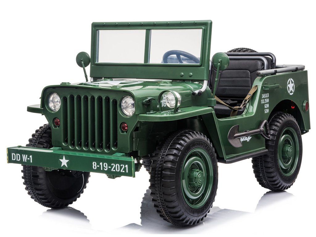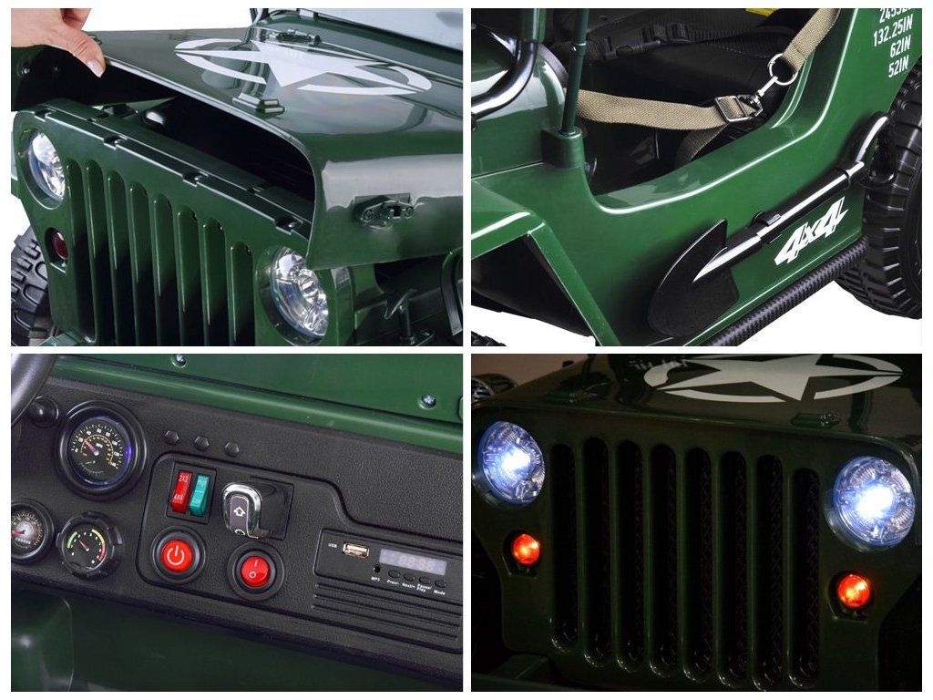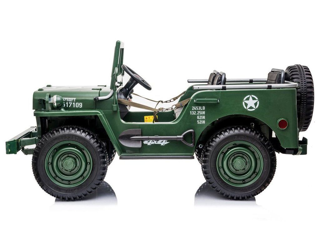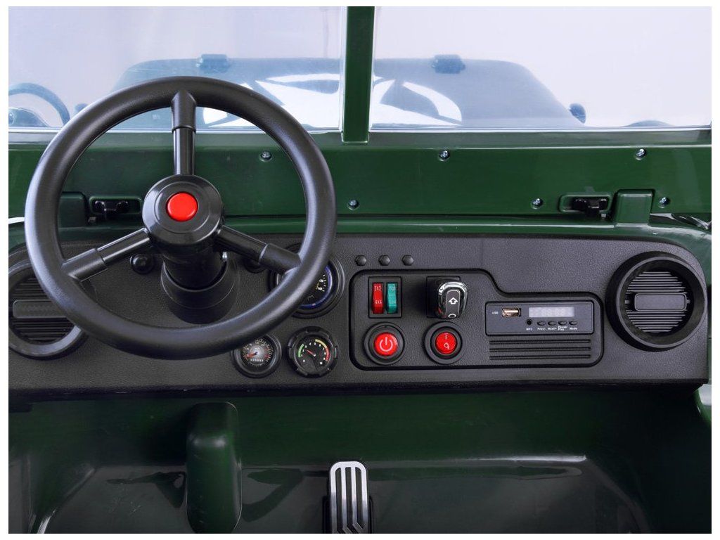 Vojenské terénne auto pre 3 osoby je ponukou pre všetky deti, ktoré majú rady vojenskú tematiku. Vojenský džíp, robustné, silné, veľké a masívne vozidlo, ktoré určite zvládne vojenské úlohy. Terénne vojenské auto, ako sa na takéto vozidlo patrí, je vybavené všetkým potrebným príslušenstvom a výstužou. Auto s pohonom na štyri kolesá má možnosť prepnúť na dva motory, vďaka čomu vodič rozhoduje, kedy má daný pohon použiť. Auto je vybavené odkladacími priestormi, batožinovým priestorom a lopatou. Má zvukové a svetelné efekty, sklopné predné sklo a široké sedadlá. Vozidlo má možnosť ovládania pomocou diaľkového ovládača alebo samostatne vodičom.