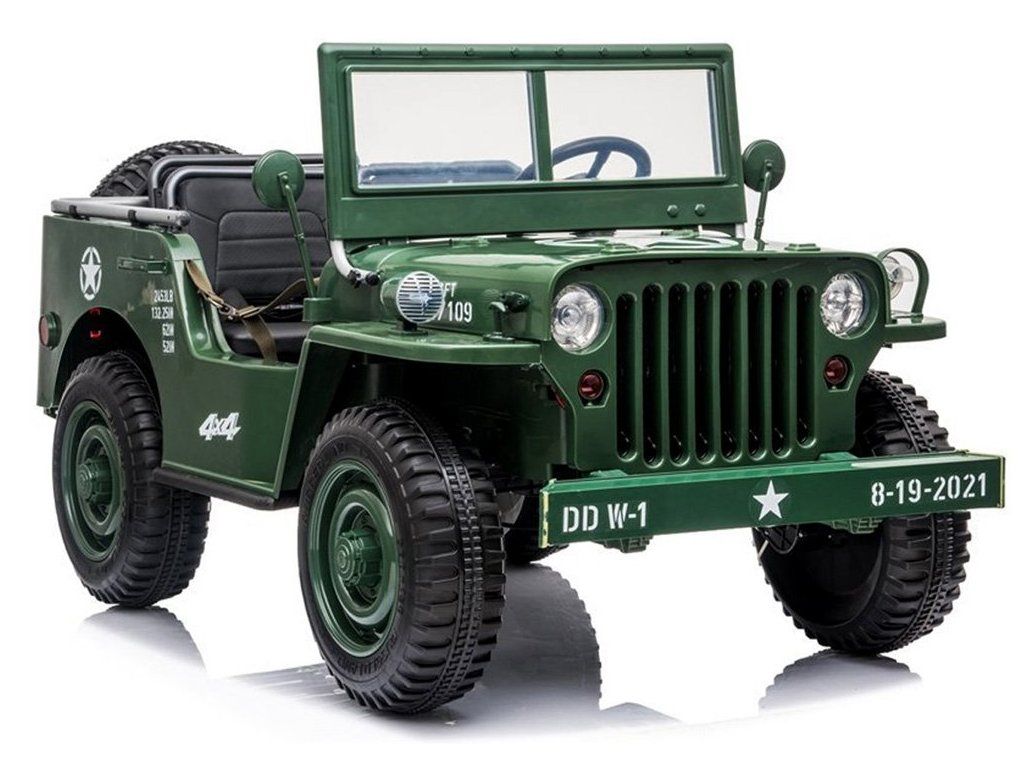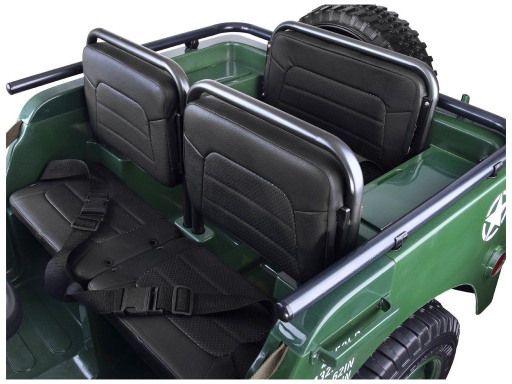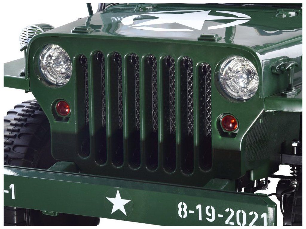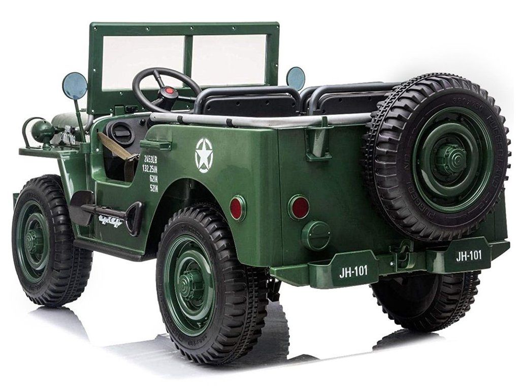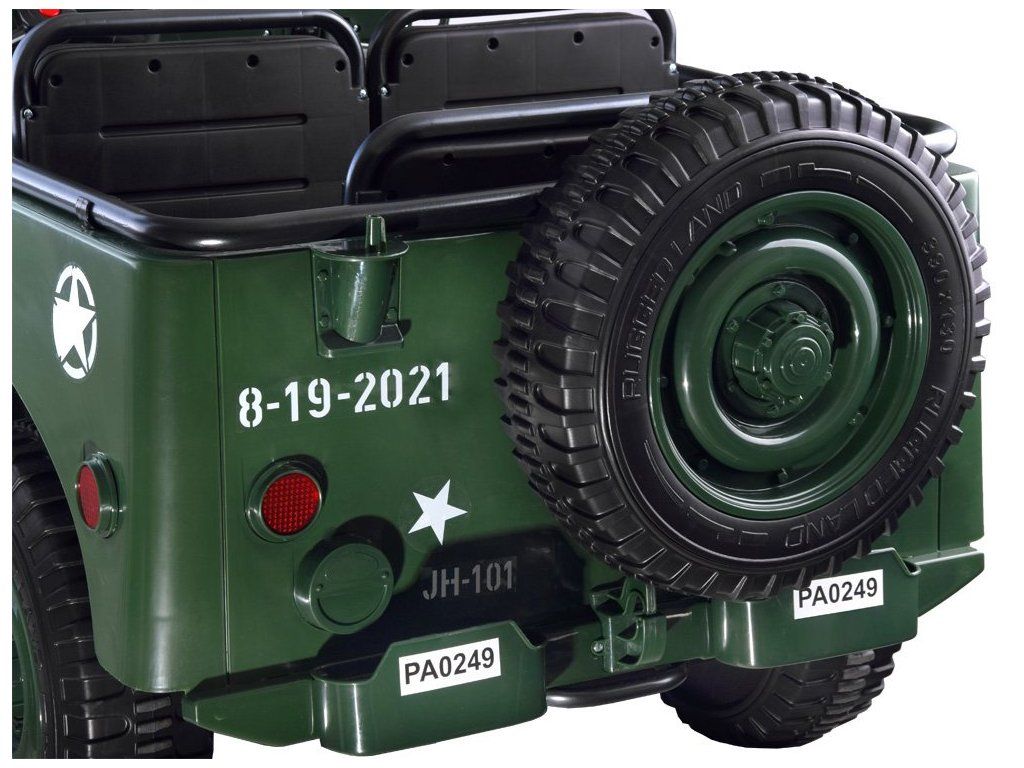 Vojenské terénne auto pre 3 osoby je ponukou pre všetky deti, ktoré majú rady vojenskú tematiku. Vojenský džíp, robustné, silné, veľké a masívne vozidlo, ktoré určite zvládne vojenské úlohy. Terénne vojenské auto, ako sa na takéto vozidlo patrí, je vybavené všetkým potrebným príslušenstvom a výstužou. Auto s pohonom na štyri kolesá má možnosť prepnúť na dva motory, vďaka čomu vodič rozhoduje, kedy má daný pohon použiť. Auto je vybavené odkladacími priestormi, batožinovým priestorom a lopatou. Má zvukové a svetelné efekty, sklopné predné sklo a široké sedadlá. Vozidlo má možnosť ovládania pomocou diaľkového ovládača alebo samostatne vodičom.
