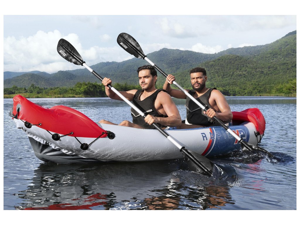 Výlet k vode je ideálny spôsob, ako stráviť voľný čas. Aby ste si tento bezstarostný čas ešte viac užili, zaobstarajte si ďalšie príslušenstvo do bazéna. Kajak je ideálny aj na rekreačné výlety na jazere alebo v bazéne. Je vyrobený z odolného vinylu, ktorý je odolný voči poškodeniu. Pohodlný kokpit má dve nafukovacie sedadlá s mäkkými operadlami, ktoré zaručujú komfort počas dlhých výletov. Odnímateľná stredová plutva pomáha udržiavať smerovú stabilitu. Kontúrovaný dizajn zabraňuje vniknutiu vody do kokpitu a potopeniu vás alebo vášho vybavenia. Madlo s integrovanými očkami vám umožňuje ľahko sa vrátiť do kajaku z vody. Integrovaný vypúšťací ventil uľahčuje vyfúknutie kajaku na konci dňa. Na prenášanie nafúknutého kajaku môžete použiť aj pevné rukoväte. Súčasťou balenia je aj pár 218 cm hliníkových pádel a opravná záplata na opravu náhodných odrenín alebo prepichnutí.