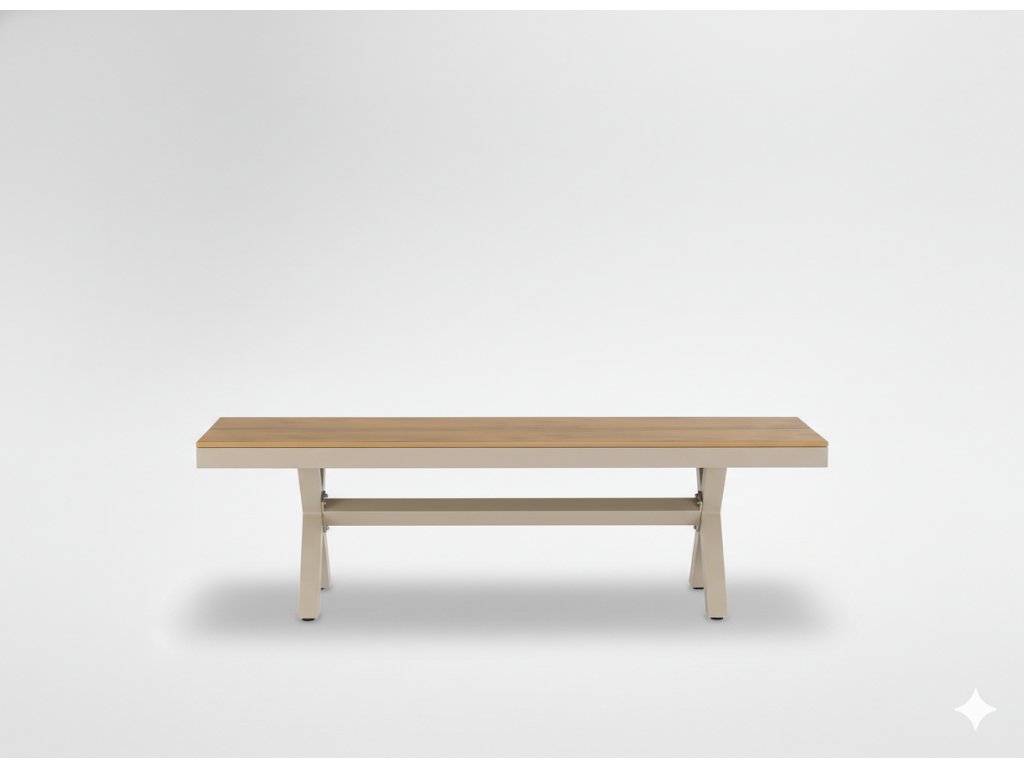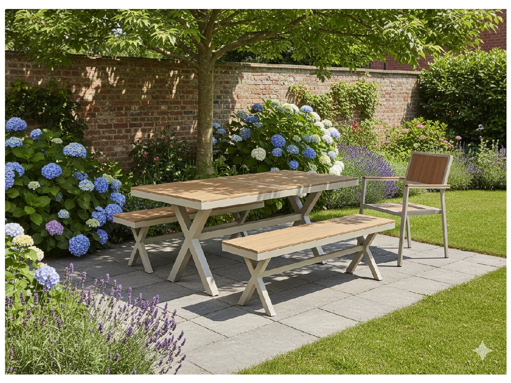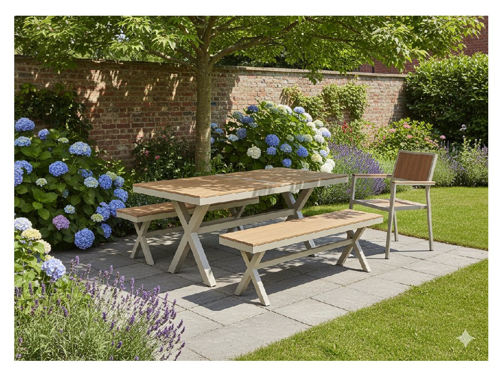 setu K lavičke si môžete dokúpiť zodpovedajúci záhradný stôl v dvoch variantoch: klasický hliníkový stôl 150 × 90 cm alebo rozkladací stôl 180/240 × 90 cm. Vďaka tomu môžete ľahko vytvoriť funkčný a estetický set, ktorý je ideálny pre vašu záhradu alebo terasu.
