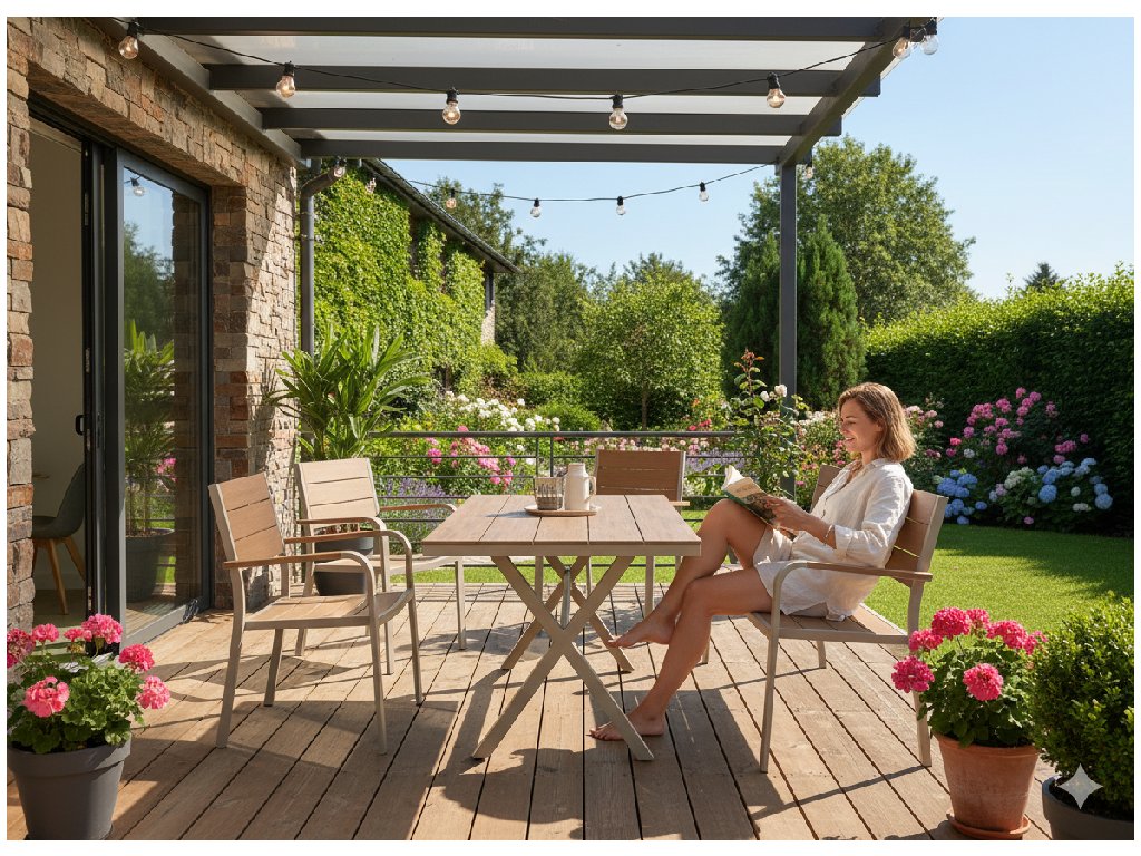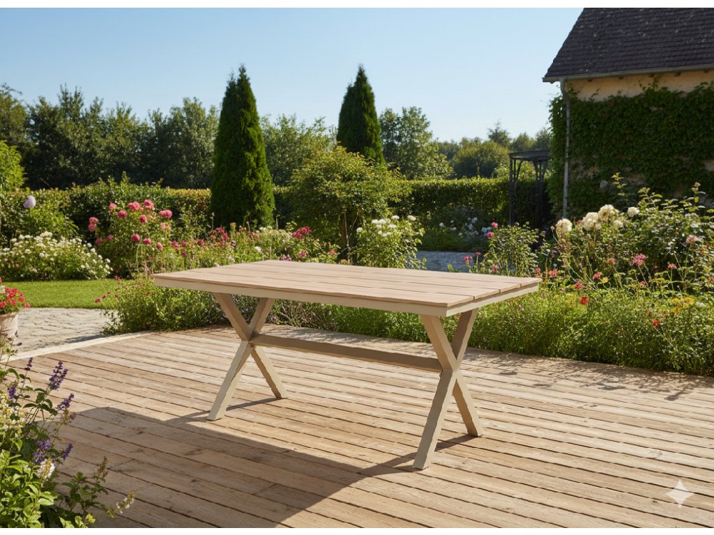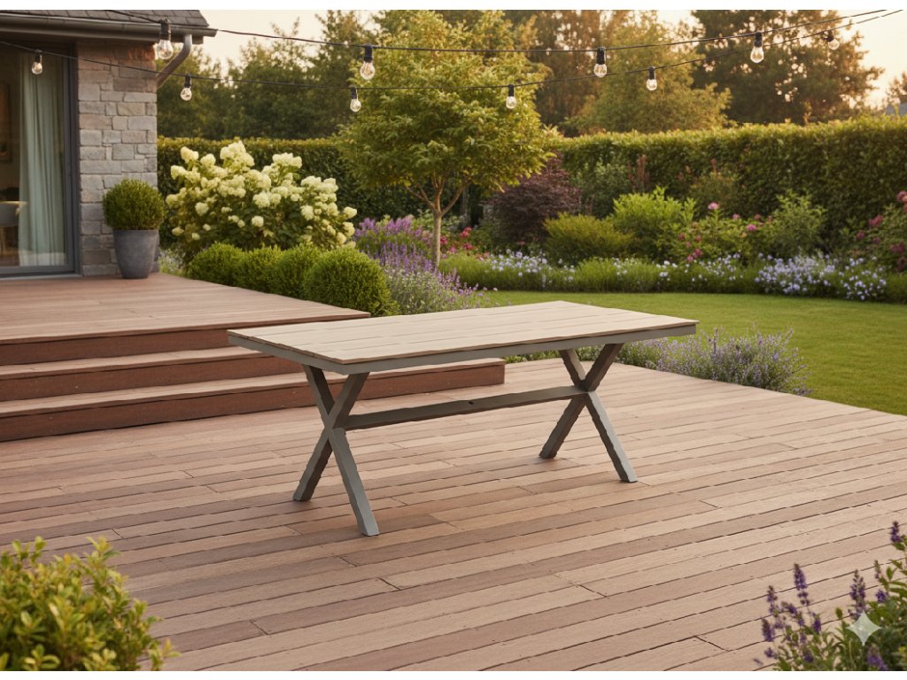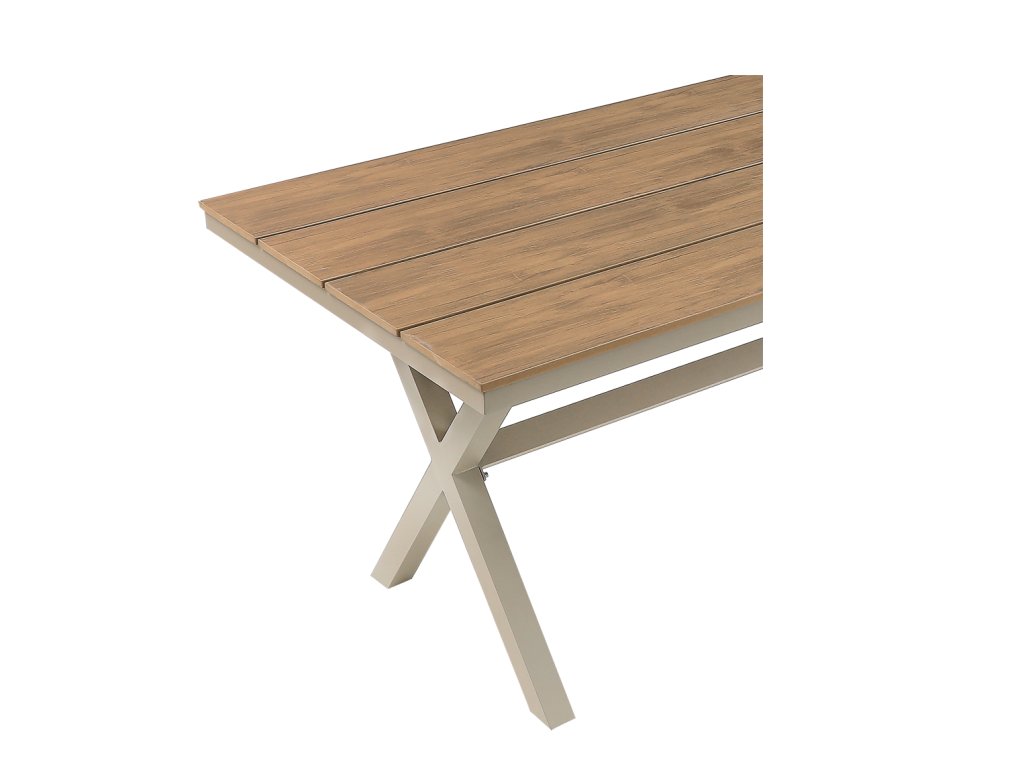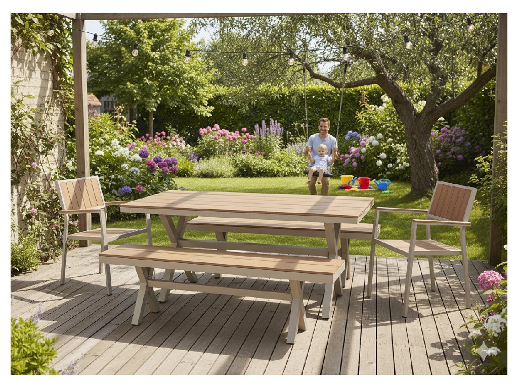 Hliníkový rám je ľahký, no zároveň mimoriadne stabilný a odolný voči korózii aj poveternostným podmienkam. Stolová doska z lamiel s imitáciou dreva prináša vzhľad prírodného materiálu bez potreby náročnej údržby. Povrch je ľahko umývateľný, farebne stály a pripravený na každodenné používanie počas celej sezóny.