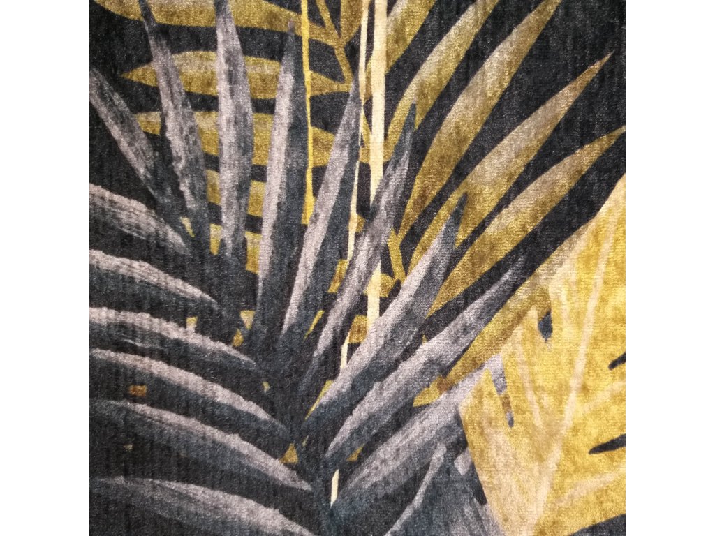 Čierno-zlatý koberec Black 01 spája moderný dizajn s praktickosťou. Palmové listy a zlaté geometrické línie vytvárajú štýlový a luxusný vzhľad, ktorý dokonale doplní obývačku, spálňu, predsieň alebo kuchyňu.