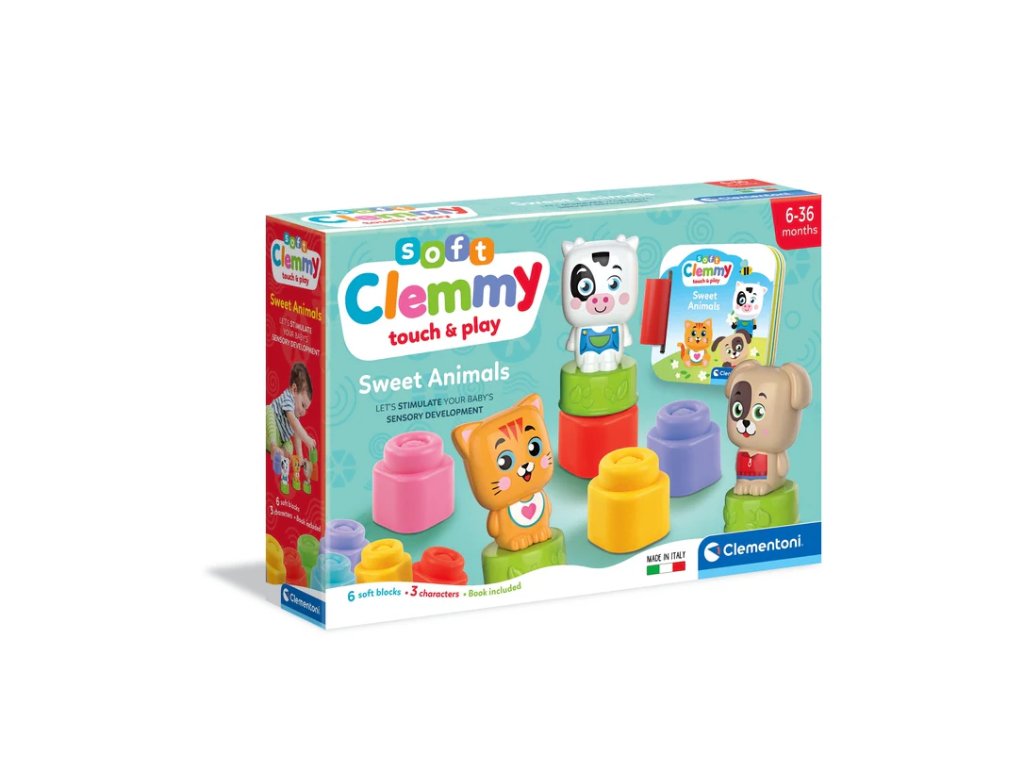 Súprava obsahuje: 6 kociek a tri figúrky. Mäkké kocky Clemmy pomáhajú rozvíjať manuálne zručnosti a stimulujú hmatové vnímanie dieťaťa.