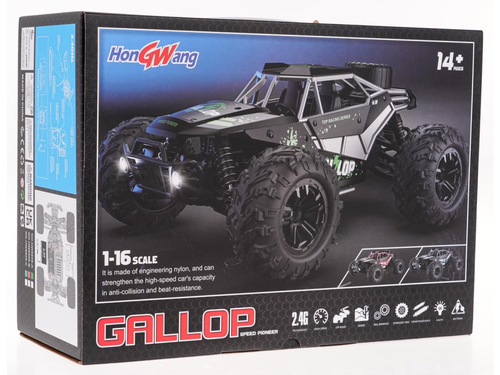 Kovový crawler Gallop v mierke 1:16, diaľkovo ovládaný s pohonom všetkých štyroch kolies, je odporúčaný pre deti od 14 rokov. Veľké gumové pneumatiky a pružinové odpruženie umožňujú vozidlu ľahko prekonávať akýkoľvek povrch. Vozidlo je vyrobené z vysoko kvalitných materiálov a má kovovú karosériu, čo zaručuje jeho odolnosť. LED osvetlenie umožňuje jazdu po zotmení. Hračka je napájaná batériou 7,4 V 1300 mAh (súčasť balenia) a diaľkové ovládanie vyžaduje 3 batérie AA 1,5 V (nie sú súčasťou balenia). Vlastnosti vozidla: - mierka 1:16, - diaľkové ovládanie 2,4 GHz, - kovová karoséria, - protikolízny dizajn, - vysoká odolnosť proti nárazom, - pohon 4x4, - nastaviteľné riadenie, - veľké gumové pneumatiky, - jazda dopredu, dozadu, doprava a doľava, - prekonáva prekážky, - má LED osvetlenie v prednej časti vozidla. |