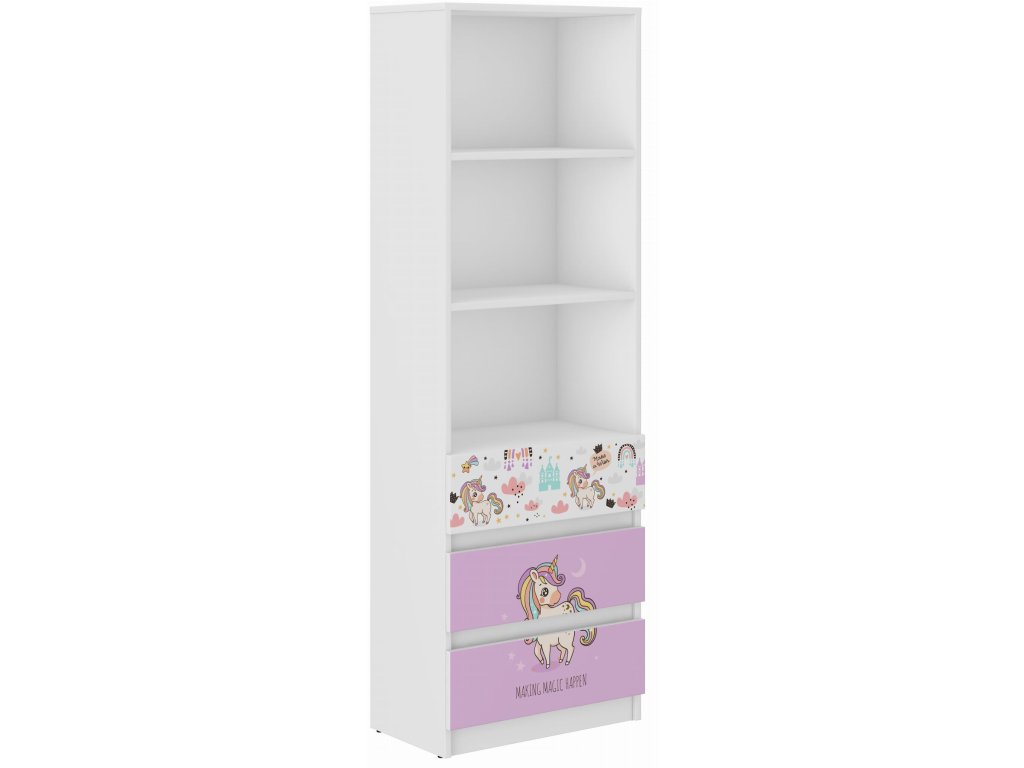 Detská knižnica B-3 Ružový jednorožec MATERIÁL:- Telo a čelné strany – laminovaná doska, vďaka ktorej má nábytok pevnú a spoľahlivú konštrukciu.