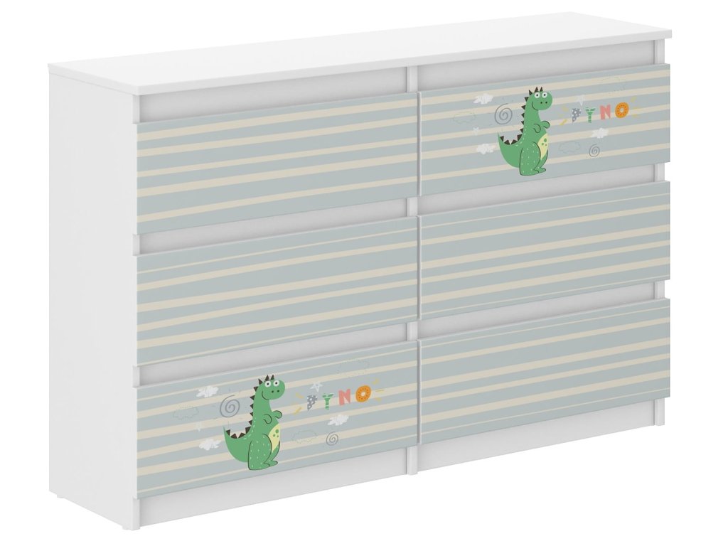 Detská komoda R-120 DINO MATERIÁL:- Korpus a čelné strany – laminovaná doska, vďaka ktorej má nábytok pevnú a spoľahlivú konštrukciu.