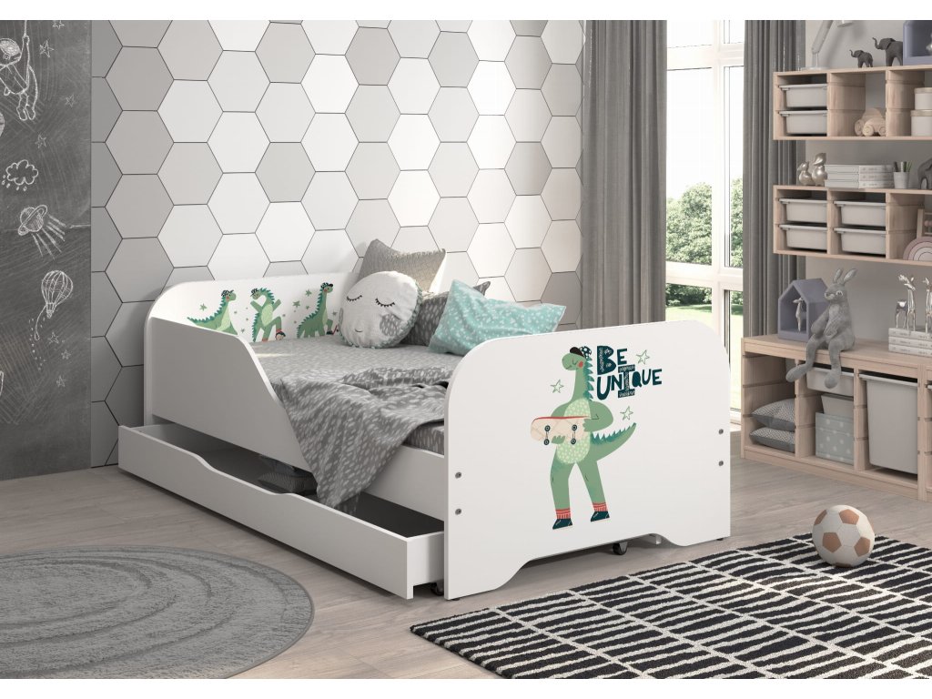 Detská posteľ MIKI 140x70 DINO TRAVEL Súprava obsahuje:- Posteľ s profilovaným bočným lemom, ktorý zaručuje bezpečnosť pri používaní.