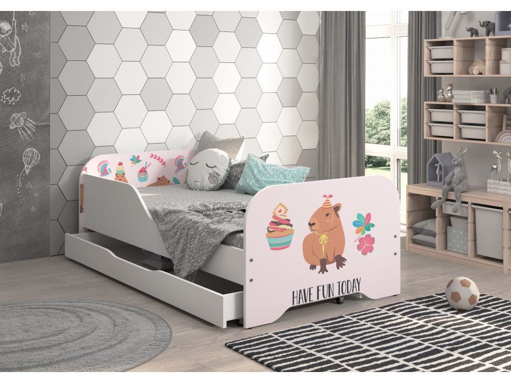 Detská posteľ MIKI 140x70 KAPIBARA COOKIES Súprava obsahuje:- Posteľ s profilovaným bočným lemom, ktorý zaručuje bezpečnosť pri používaní.