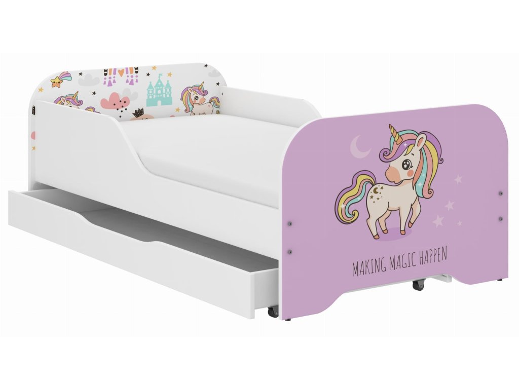 Detská posteľ MIKI 140x70 Ružový jednorožec Súprava obsahuje:- Posteľ s profilovaným bočným lemom, ktorý zaručuje bezpečnosť pri používaní.