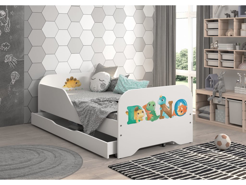 Detská posteľ MIKI 160x80 DINO KIDS Súprava obsahuje:- Posteľ s profilovaným bočným lemom, ktorý zaručuje bezpečnosť pri používaní.