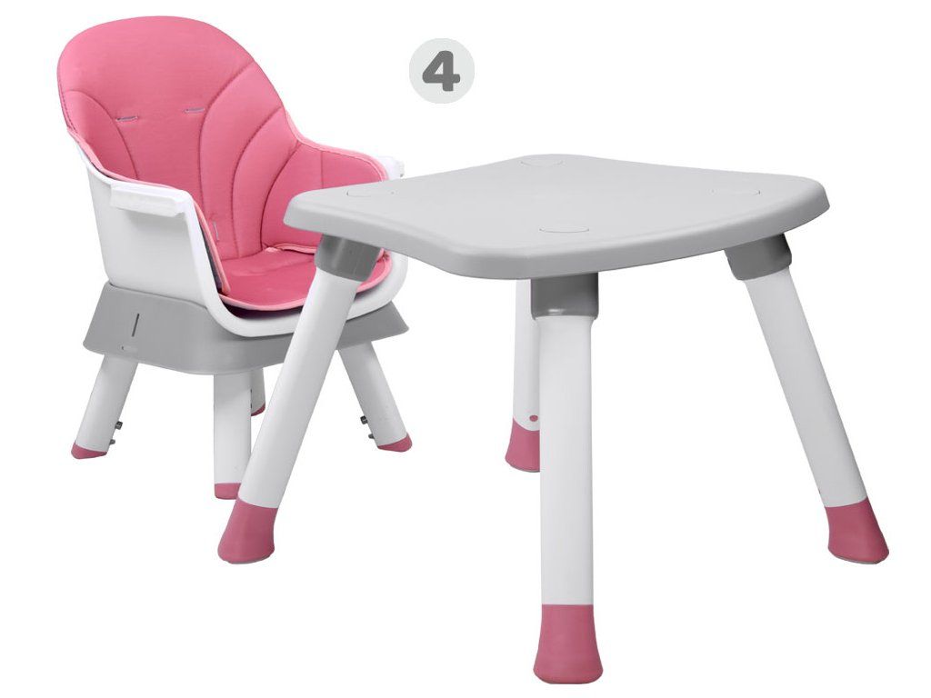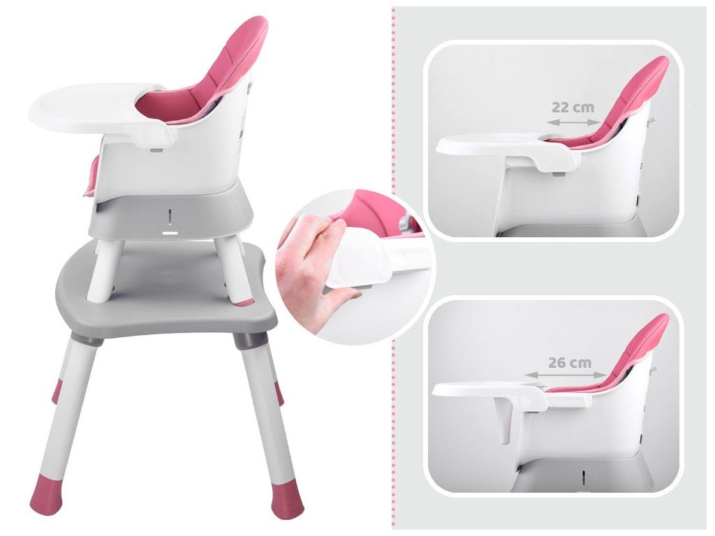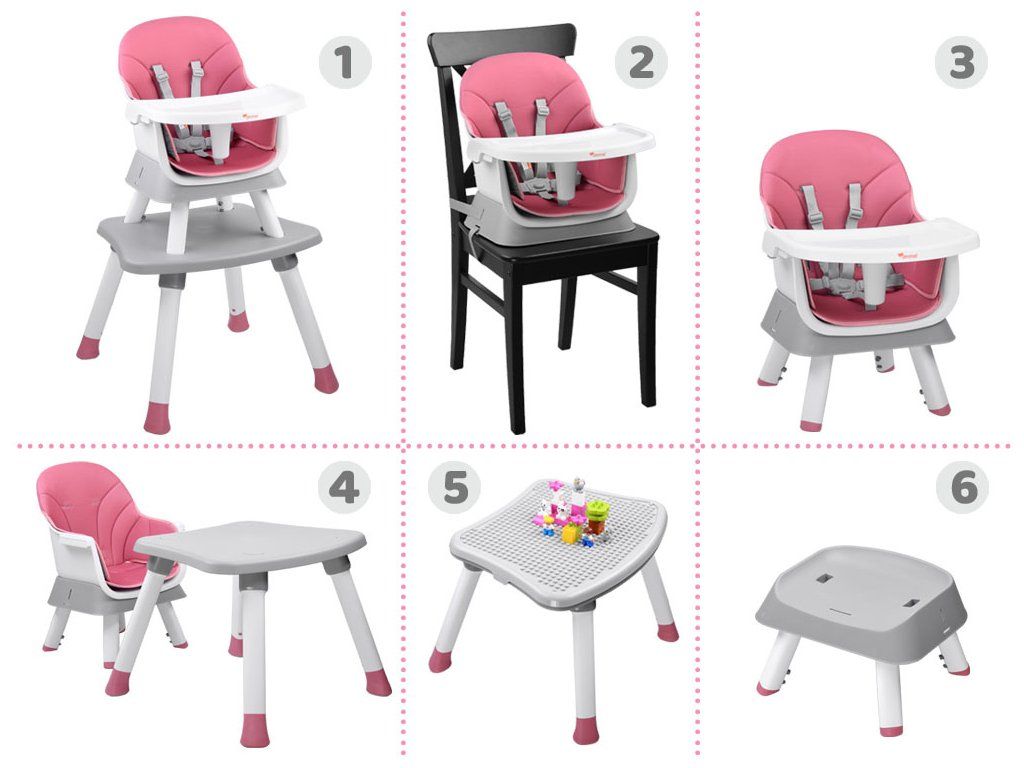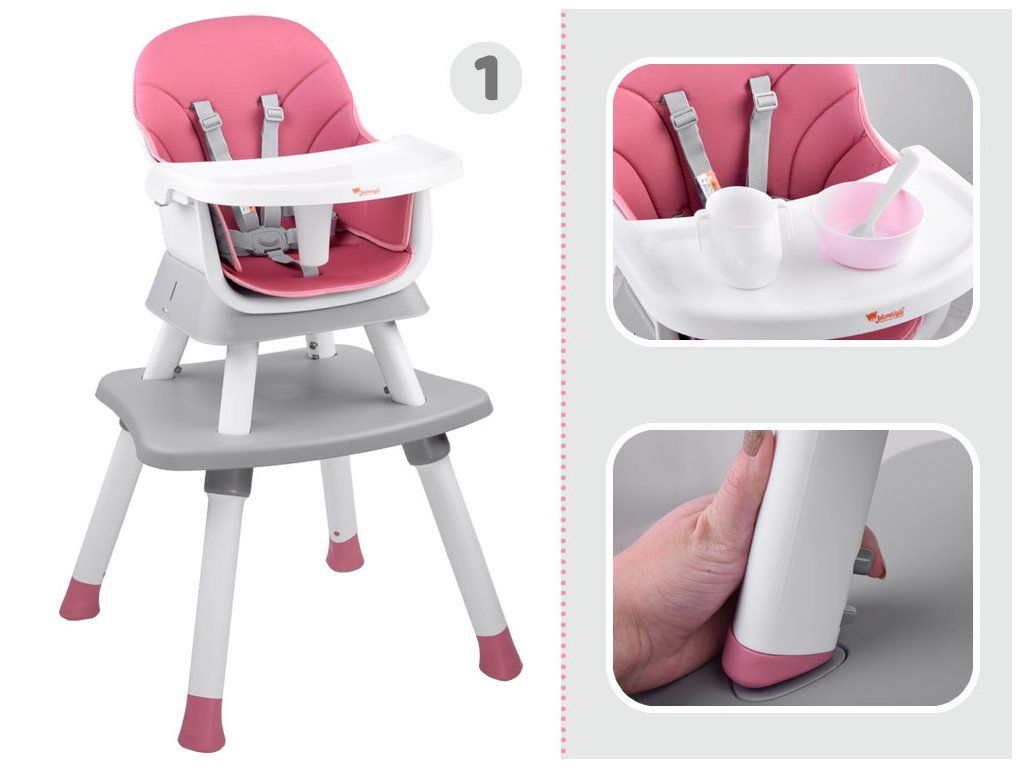 Detská stolička na kŕmenie je súprava 6 v 1, ideálna pre deti už od 6 mesiacov, ktoré začali samostatne sedieť. Modulárny nábytok v modernom štýle sa hodí do každej detskej izby, obývačky aj kuchyne. Vďaka rôznym možnostiam použitia sa hodí k stolu v jedálni, ale aj do detského kútika. Pohodlná stolička s správnym tvarovaním je vybavená päťbodovými bezpečnostnými pásmi a poistkou proti skĺznutiu zo stoličky. Čalúnenie stoličky je priedušné a vyrobené z ľahko čistiteľného materiálu, čo má zásadný význam pre udržiavanie čistoty nábytku. Nábytok má odnímateľný podnos, ktorý sa ľahko udržiava v čistote. Nohy stoličky sú vybavené protisklzovými podložkami. Tento multifunkčný nábytok bude rásť spolu s dieťaťom a bez problémov sa prispôsobí potrebám danej situácie.