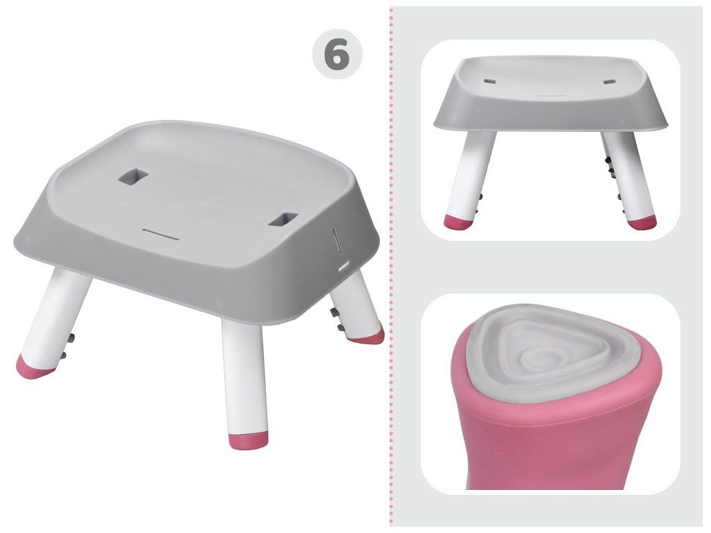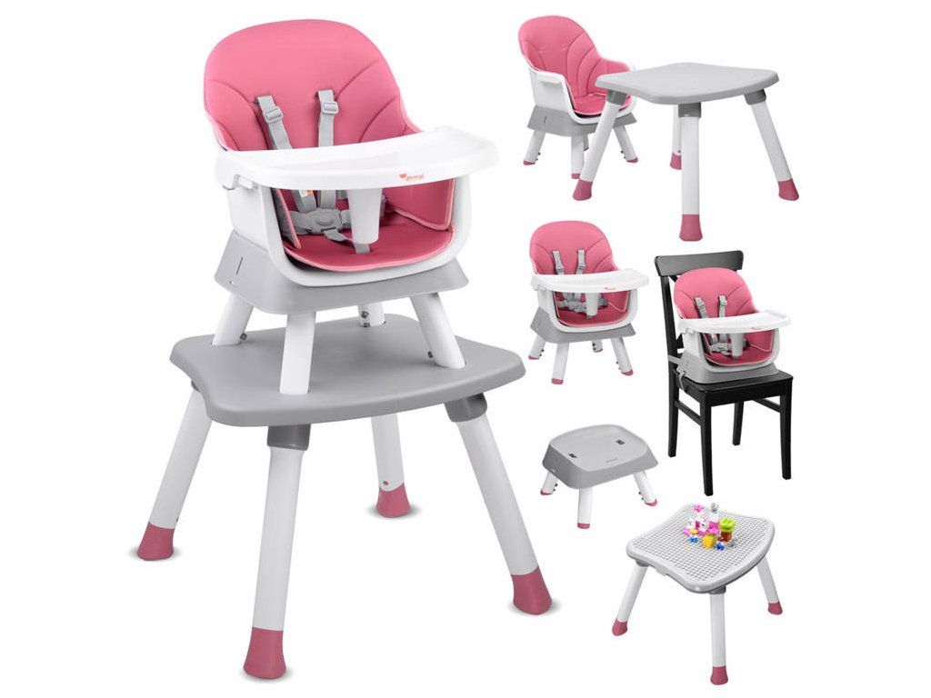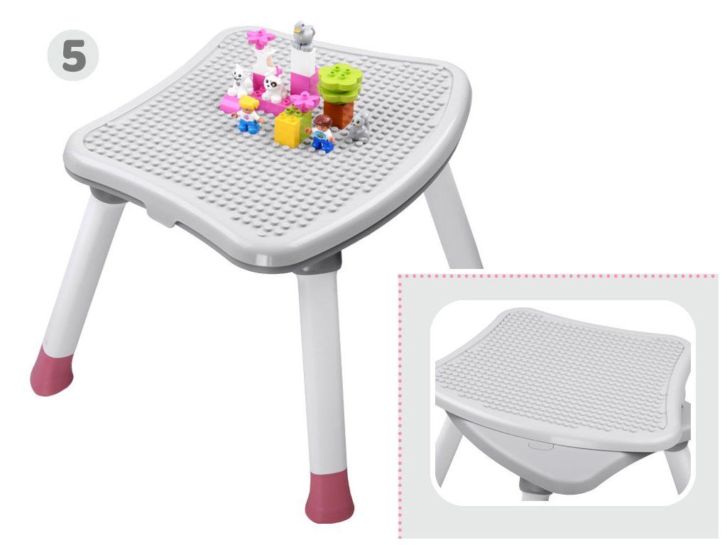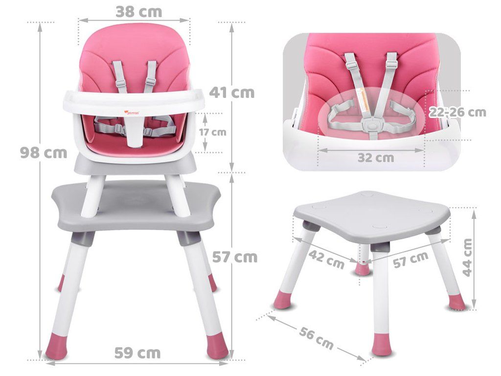 Detská stolička na kŕmenie je súprava 6 v 1, ideálna pre deti už od 6 mesiacov, ktoré začali samostatne sedieť. Modulárny nábytok v modernom štýle sa hodí do každej detskej izby, obývačky aj kuchyne. Vďaka rôznym možnostiam použitia sa hodí k stolu v jedálni, ale aj do detského kútika. Pohodlná stolička s správnym tvarovaním je vybavená päťbodovými bezpečnostnými pásmi a poistkou proti skĺznutiu zo stoličky. Čalúnenie stoličky je priedušné a vyrobené z ľahko čistiteľného materiálu, čo má zásadný význam pre udržiavanie čistoty nábytku. Nábytok má odnímateľný podnos, ktorý sa ľahko udržiava v čistote. Nohy stoličky sú vybavené protisklzovými podložkami. Tento multifunkčný nábytok bude rásť spolu s dieťaťom a bez problémov sa prispôsobí potrebám danej situácie.