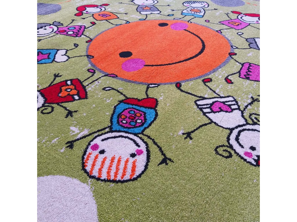 Detský farebný koberec s motívom detí Bella 117 vnesie do detskej izby pozitívnu energiu, hravosť a pocit radosti. Veselý motív usmiateho slnka obklopeného deťmi vytvára priateľskú atmosféru a podporuje sociálnu predstavivosť, spoluprácu a kreatívnu hru. Koberec pôsobí optimisticky a stane sa prirodzeným stredobodom priestoru.