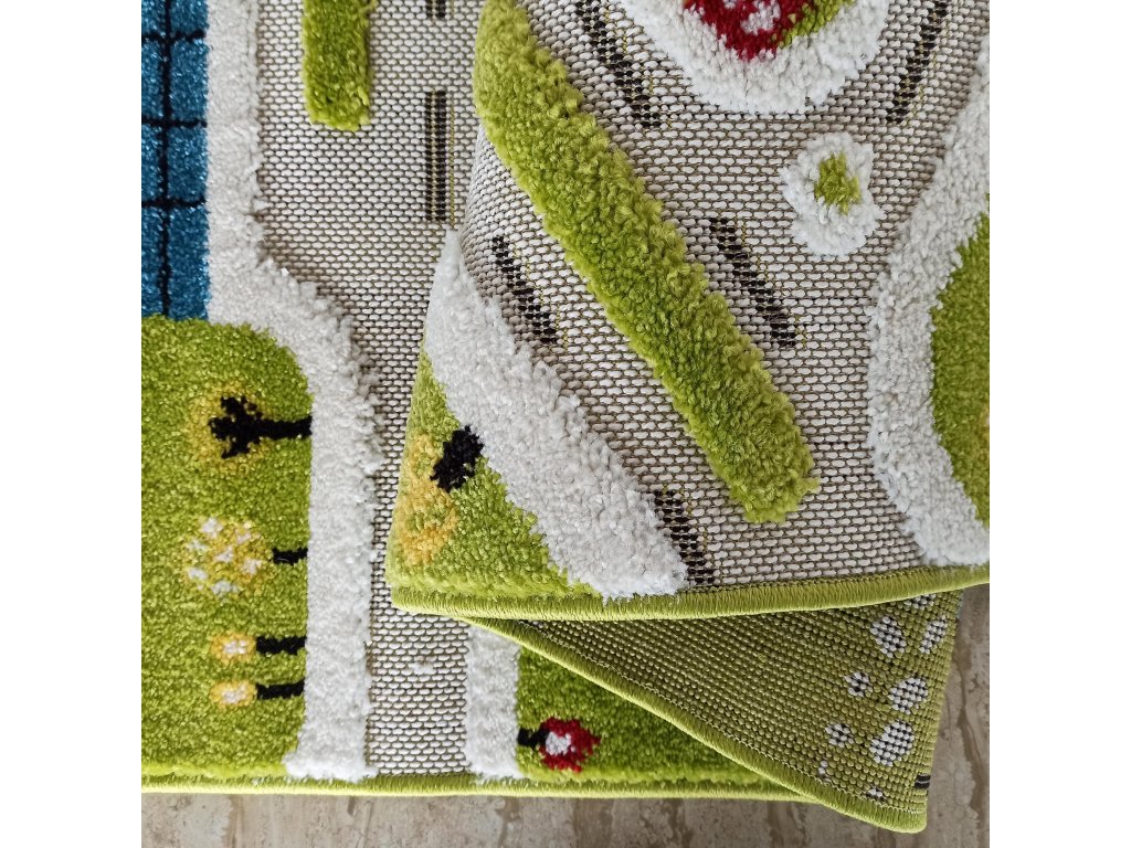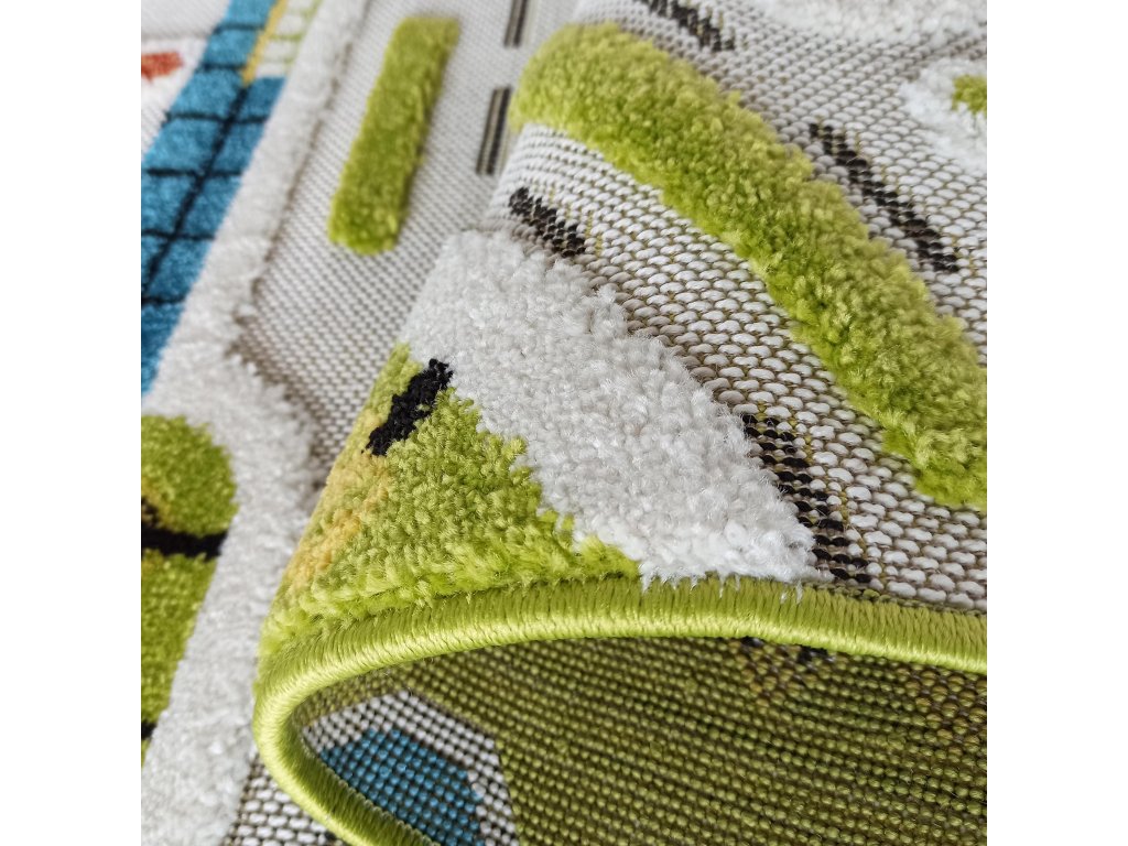 Detský farebný koberec s motívom mesta Color Kids 01 je ideálnym doplnkom do každej detskej izbičky, či už pre chlapcov alebo dievčatá. Tento štýlový kusový koberec je vyrobený z vysoko kvalitného 100 % polypropylénu, ktorý je odolný voči oderu, praktický a zároveň veľmi príjemný na dotyk. Vďaka svojmu 3D efektu a pestrofarebnému dizajnu podporuje zmyslové vnímanie a hmatové dojmy dieťaťa, čím stimuluje motoriku a kreatívnu hru.