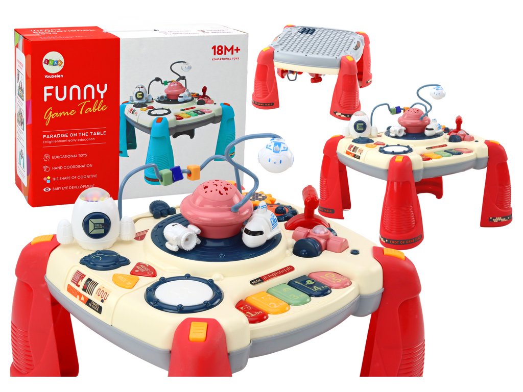 Vzdelávací stôl stojí na štyroch červených nohách, ktoré sa dajú odňať, takže deti môžu hrať priamo na podlahe. Okrem toho má stôl na druhej strane úchytky, ktoré umožňujú staviť bloky a hrať sa so zmyslami.