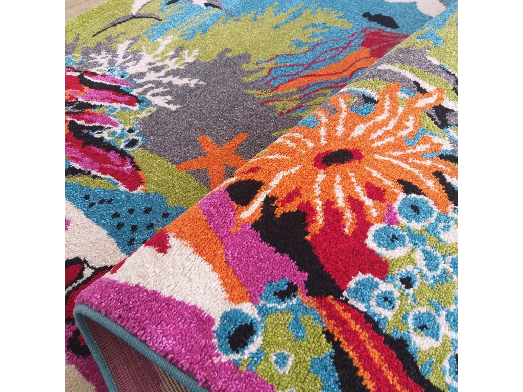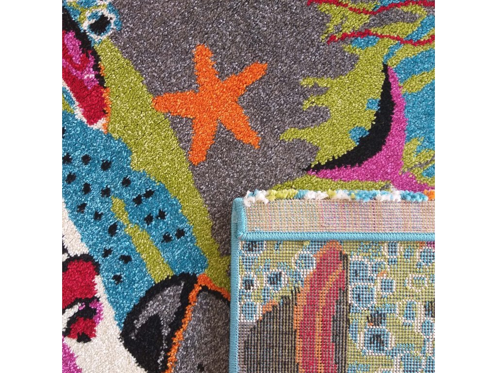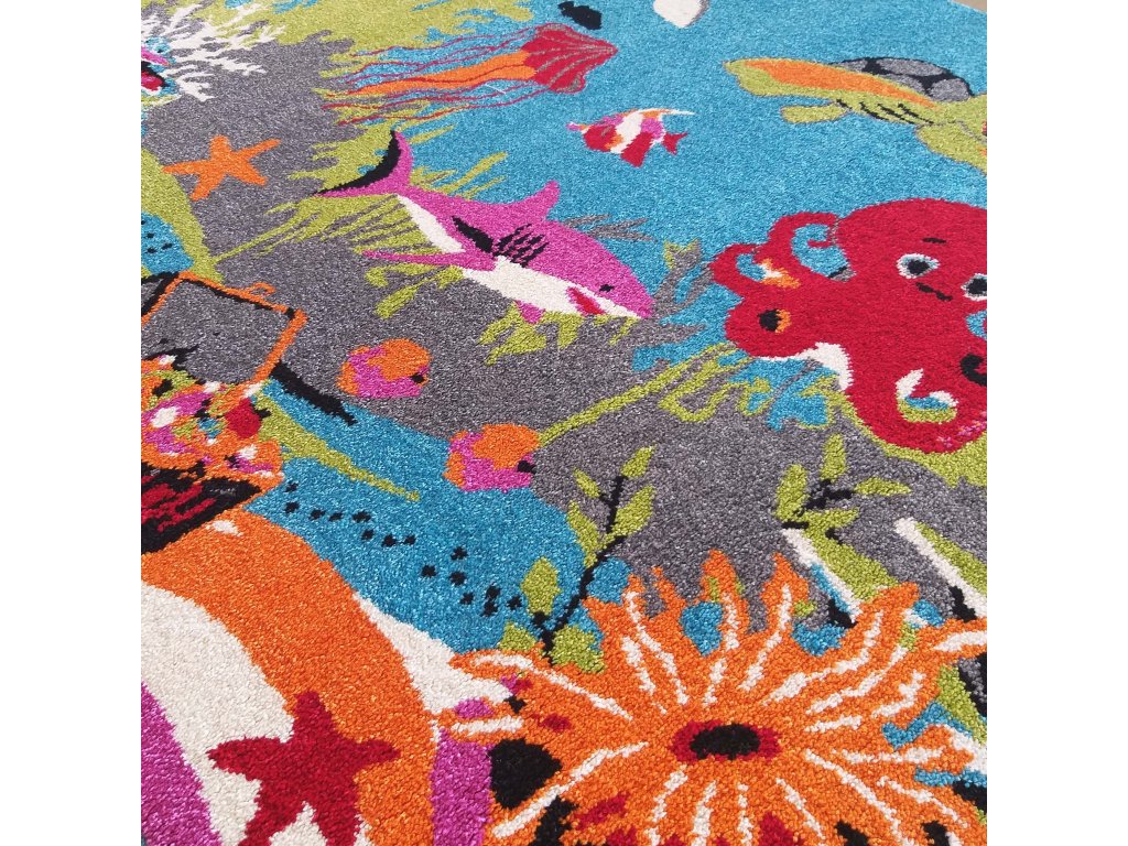Detský koberec s motívom Morský svet 104 zaujme krásnymi sýtymi farbami a hravým dizajnom podmorského sveta, ktorý podporuje detskú fantáziu a radosť z hry. Motívy morských zvieratiek vytvárajú veselú a príjemnú atmosféru v detskej izbe pre dievčatá aj chlapcov.