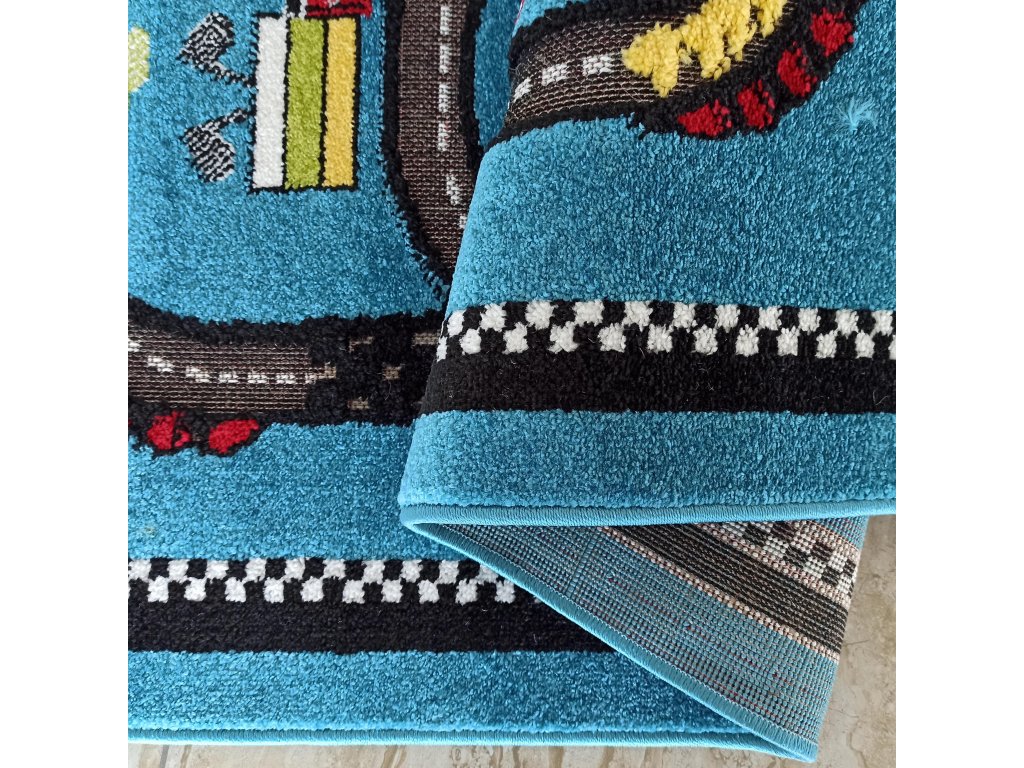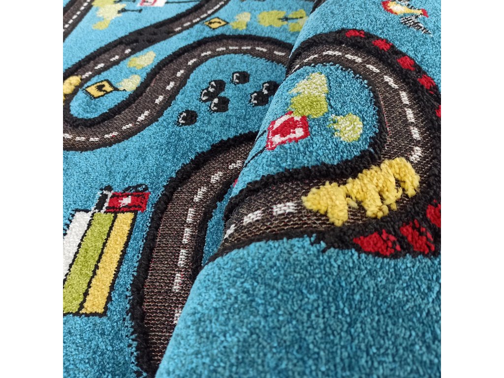 Detský modrý koberec s motívom autodráhy Color Kids 04 je ideálnym miestom na hru pre všetkých malých milovníkov autíčok a pretekov. Dynamický vzor autodráhy povzbudzuje detskú predstavivosť a mení koberec na pretekársku trať plnú zákrut a ciest, kde sa každá hra stáva dobrodružstvom. Rôzna výška materiálu vytvára jemný 3D efekt, ktorý stimuluje hmatové a zmyslové vnímanie dieťaťa.