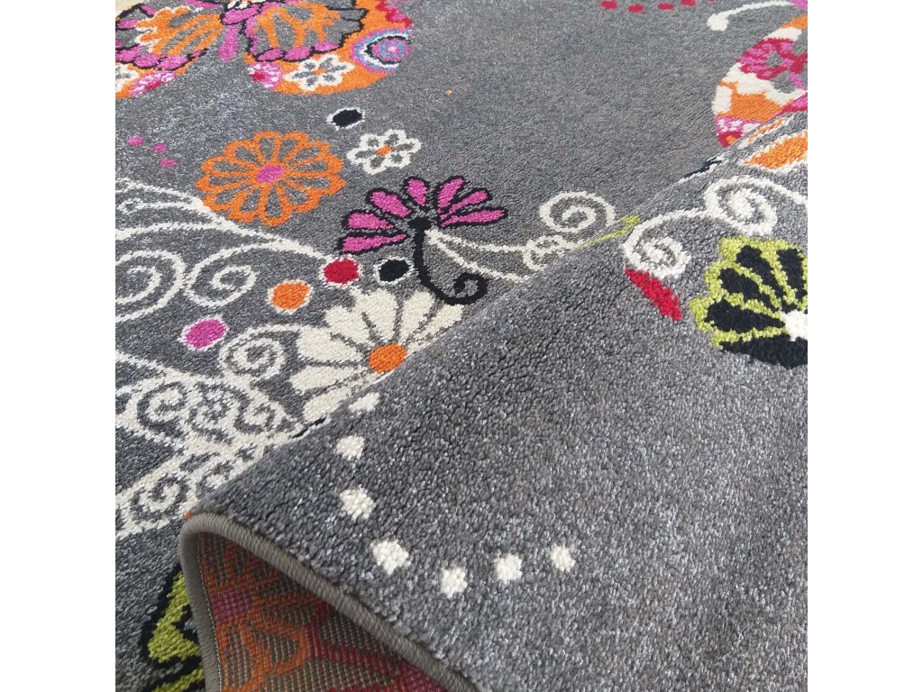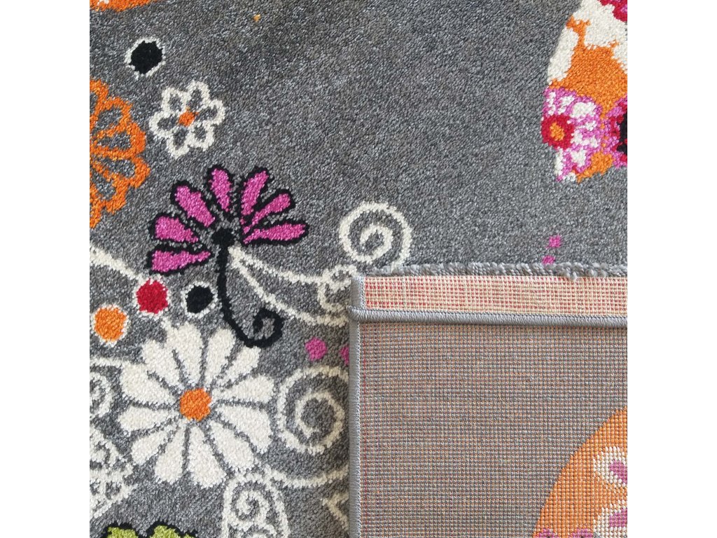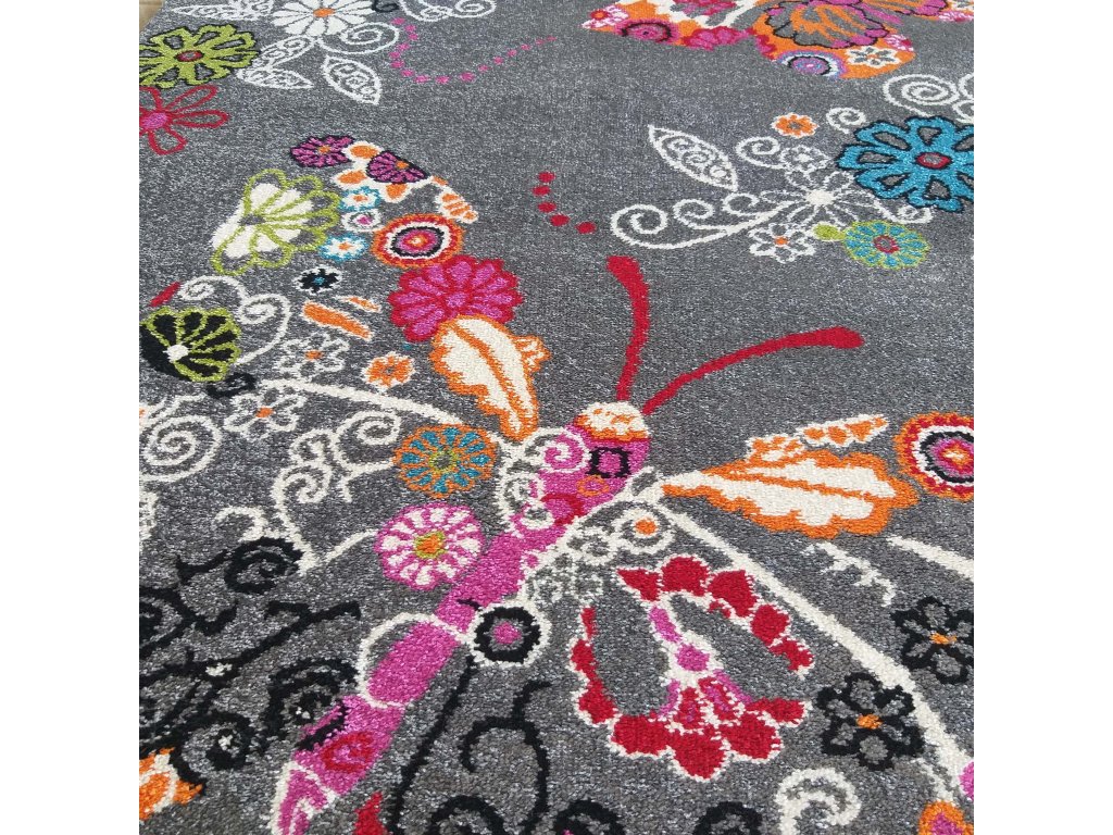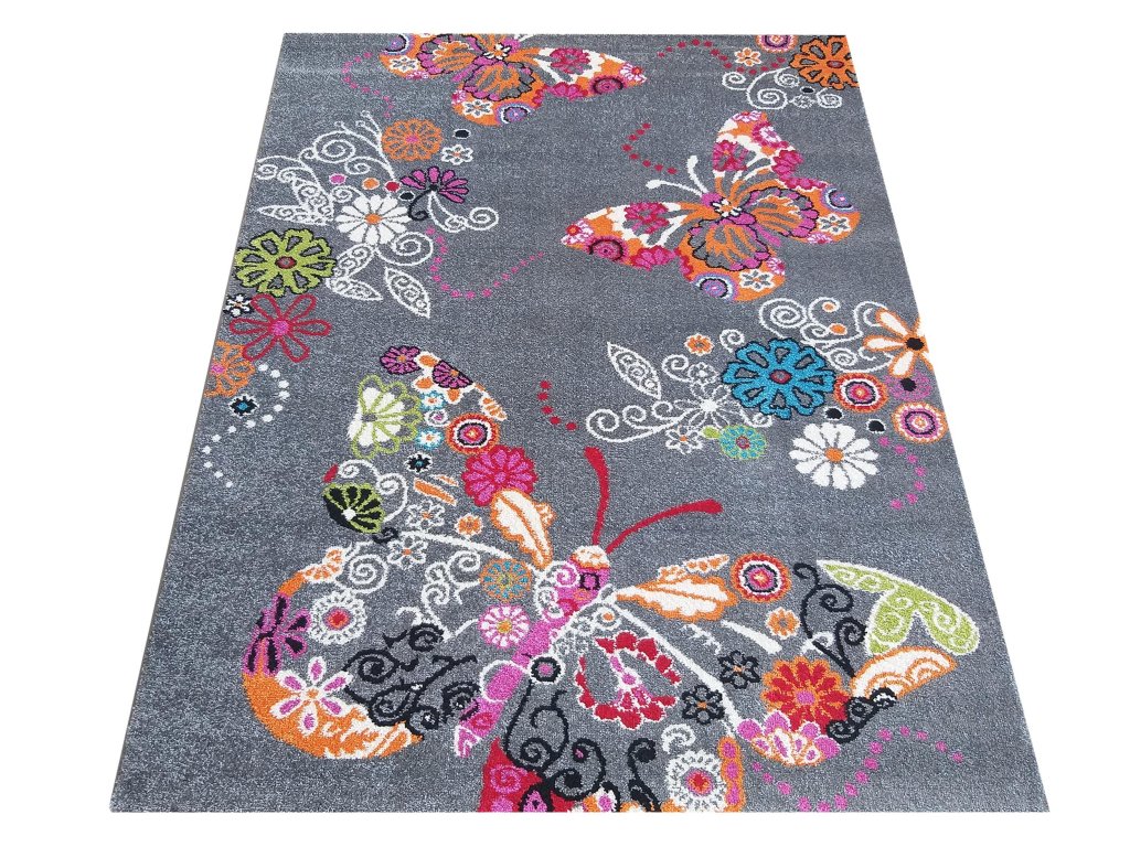 Detský sivý koberec s motýľmi Bella 114 je moderným a univerzálnym doplnkom do detskej izby. Neutrálna sivá farba sa ľahko kombinuje s rôznymi štýlmi nábytku a doplnkov, zatiaľ čo farebné motýle dodávajú koberci hravý a veselý vzhľad.