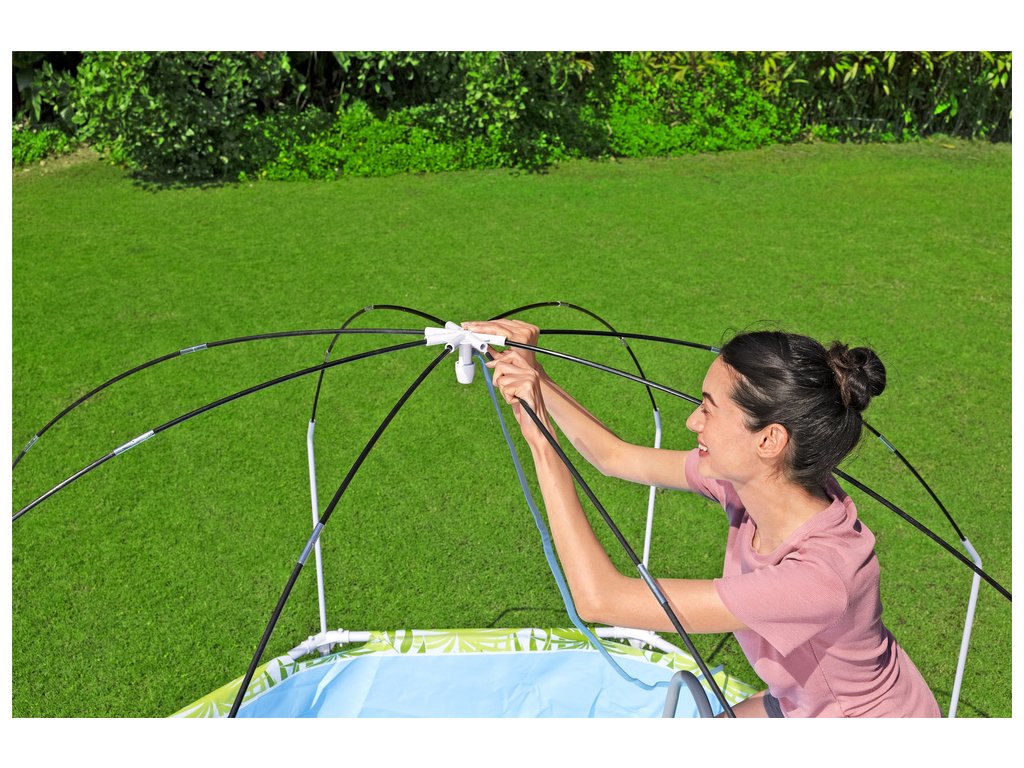 Tento záhradný bazén sa rýchlo stane obľúbeným miestom letného oddychu a centrom detských hier. Zaujímavá grafika určite upúta pozornosť každého dieťaťa. Bol navrhnutý tak, aby deti počas prázdnin motivoval k pohybu a spoločnej zábave. Vďaka svojim rozmerom je ideálny pre deti od 3 rokov. Bazén sa veľmi ľahko montuje a demontuje a na jeho zostavenie nepotrebujete žiadne ďalšie náradie. Súčasťou balenia je strecha, ktorá poskytne vašim deťom tieň v horúcich dňoch, a vstavaný rozprašovač im prinesie extra zábavu a osvieženie. Na aktiváciu rozprašovača stačí pripojiť záhradnú hadicu. Steny a dno bazénu sú vyrobené z odolného PVC materiálu.