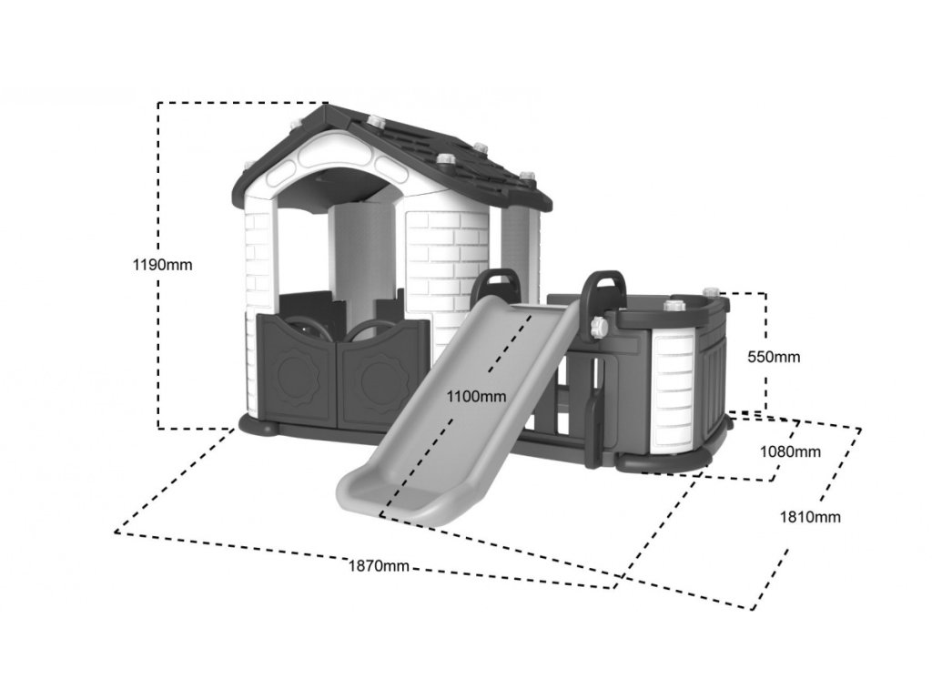 | Všetky prvky domčeka sú vyrobené z vysoko kvalitného materiálu HDPE. Ide o polyetylén s vysokou hustotou, v rozmedzí od 0,942 do 0,965 g/cm3. HDPE je flexibilnejší materiál a odolnejší voči mechanickému poškodeniu v porovnaní s materiálmi používanými v iných konštrukciách tohto typu. Všetky steny a komponenty sú vyrobené z dvojitej vrstvy plastu. To navyše umožňuje vyplniť steny pieskom alebo kamenivom, aby sa zabezpečila stabilita konštrukcie. Veľké komponenty uľahčujú montáž. |