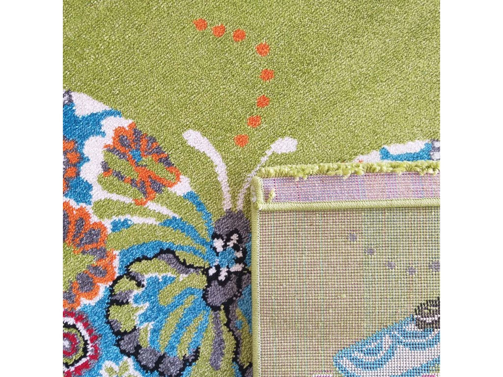 Detský zelený koberec s motýľmi Bella 114 vytvára v detskej izbe pokojné a príjemné prostredie. Zelená farba pôsobí prirodzene a harmonicky, motýlie motívy dodávajú koberci jemný a hravý vzhľad.