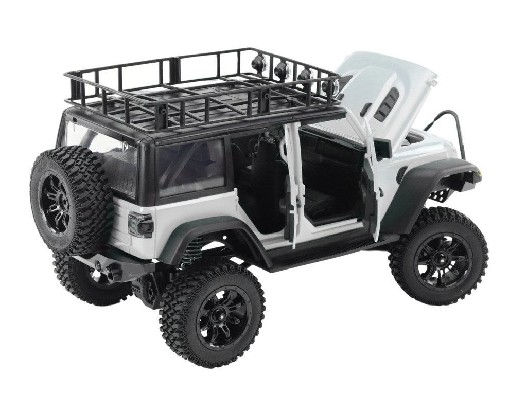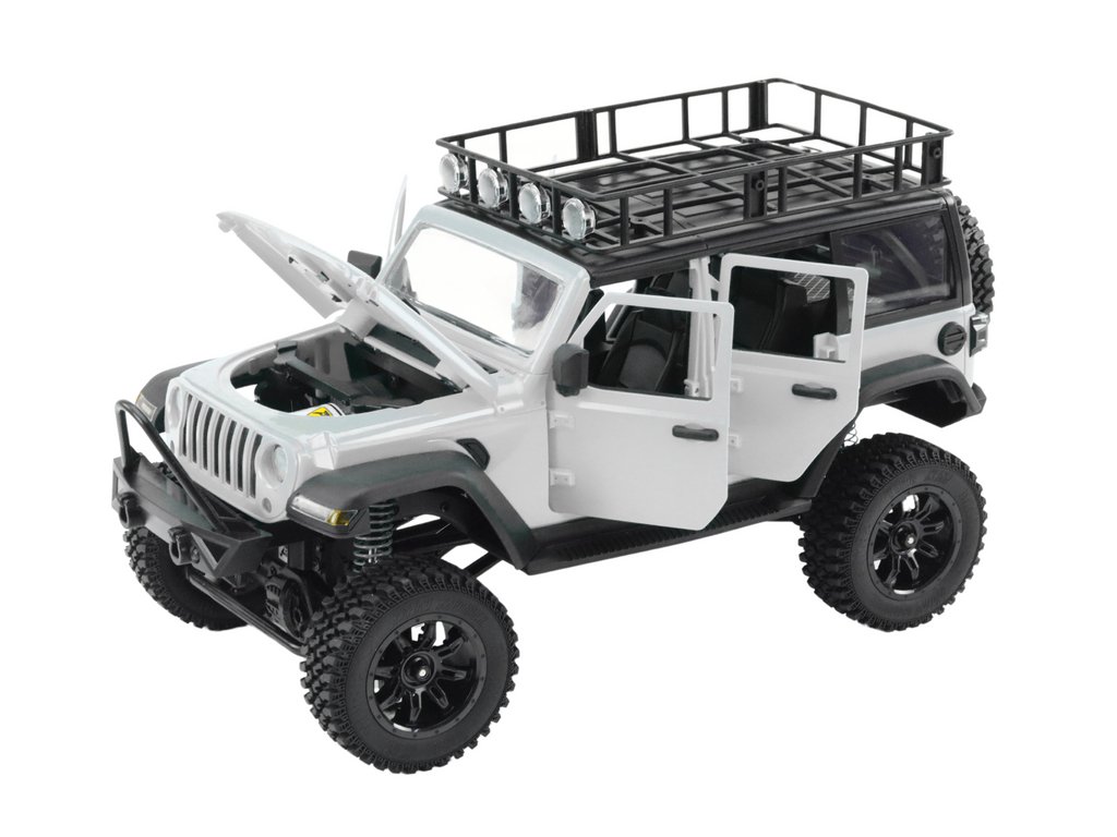 Vozidlo je tiež vybavené funkčnými prednými a zadnými svetlami, ktoré nielen prispievajú k jeho realistickému vzhľadu, ale tiež zvyšujú možnosti jazdy za zhoršených svetelných podmienok alebo v noci. Ovládanie prebieha prostredníctvom moderného diaľkového ovládača 2,4 G, ktorý zabezpečuje presné ovládanie vozidla. Diaľkový ovládač umožňuje celý rozsah pohybov a dvojstupňovú zmenu rýchlosti, vďaka čomu môžete prispôsobiť rýchlosť jazdy svojim individuálnym potrebám a preferenciám. Okrem toho funkcia ťahovej brzdy umožňuje rýchlo a bezpečne zastaviť vozidlo a ľahko reagovať na prekážky.