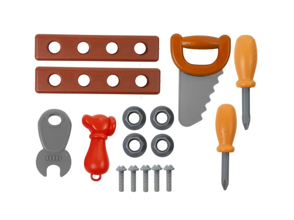 Súprava obsahuje realistické náradie, ako je kladivo, pílka, skrutkovače, kľúč a uhlový držiak, ako aj stavebné prvky, ktoré umožňujú simuláciu skutočného domáceho majstrovania. Je to skvelá vzdelávacia hračka, ktorá učí deti presnosti, trpezlivosti a logickému mysleniu.