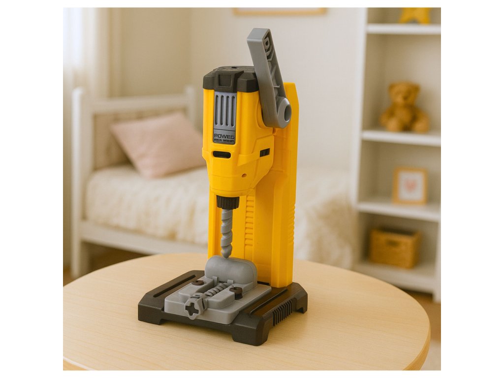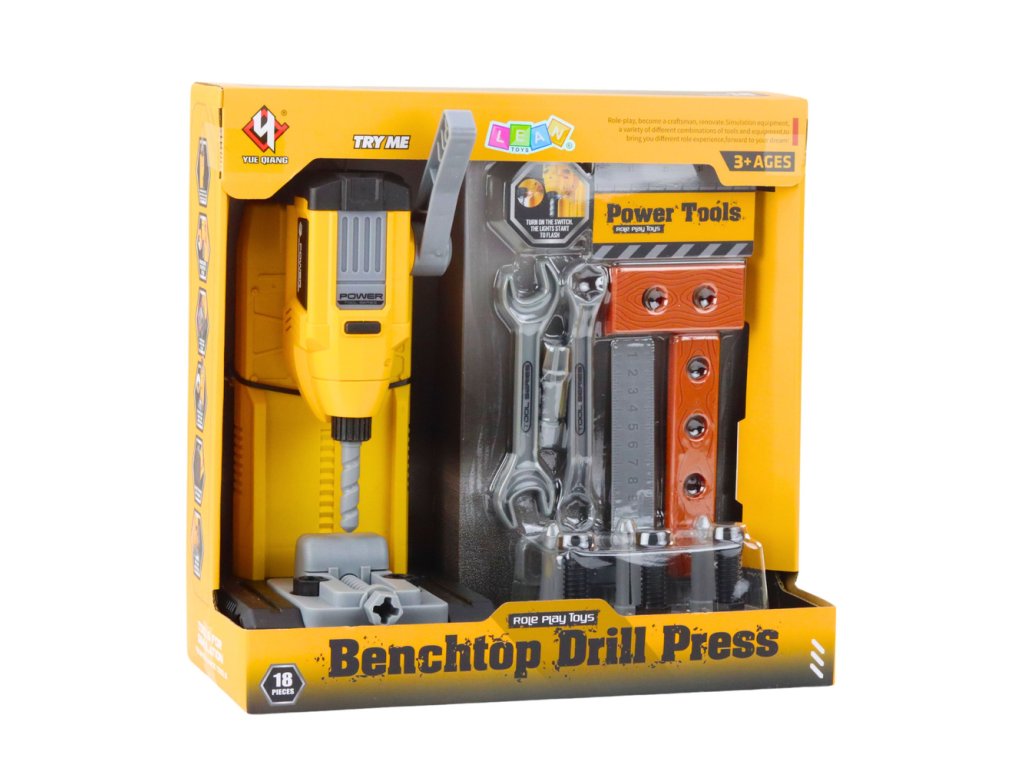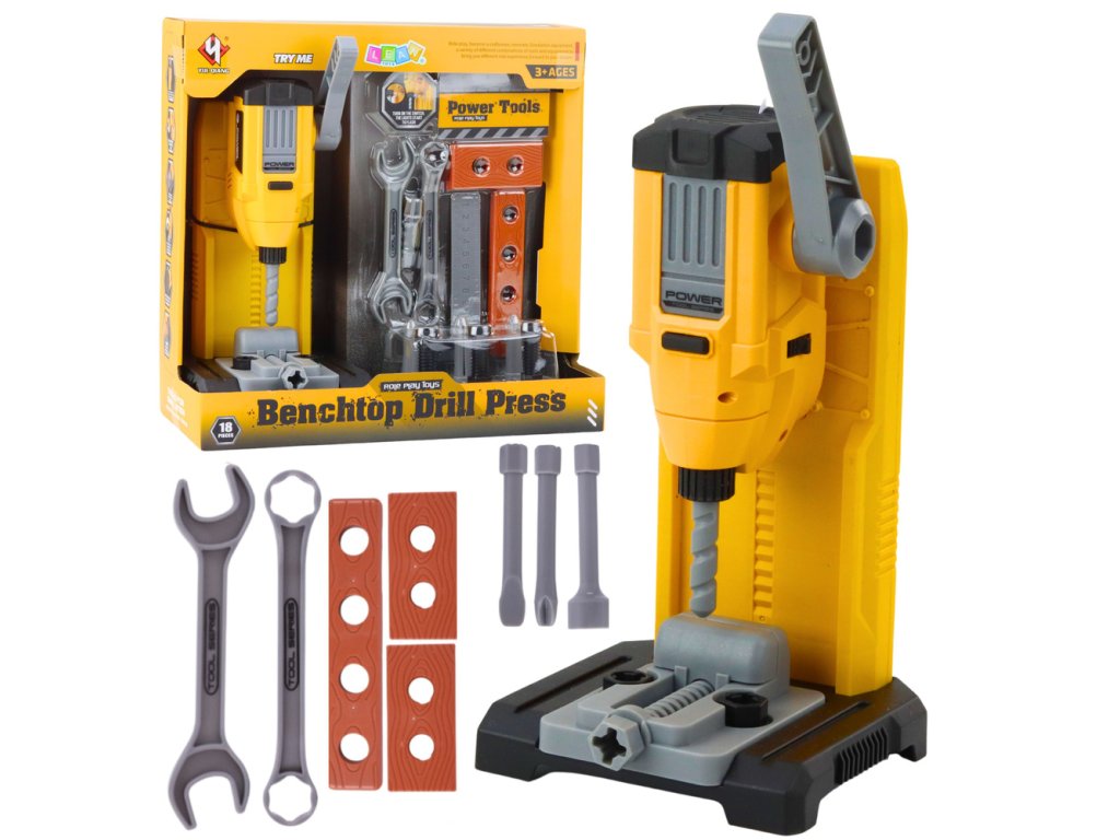 Centrálnym prvkom sady je stolová vŕtačka s nastaviteľnou výškou a pohyblivými pracovnými časťami. Po aktivácii hračka vydáva zvuky a svetelné efekty, čo zvyšuje realizmus hry a udržuje dieťa dlhšie zaujaté. Rôzne príslušenstvo umožňuje deťom simulovať skrutkovanie, vŕtanie a montáž, čím rozvíjajú manuálne zručnosti, koordináciu rúk a očí a kreativitu.