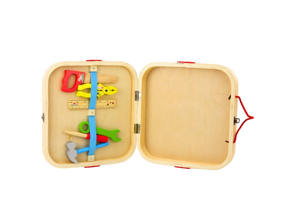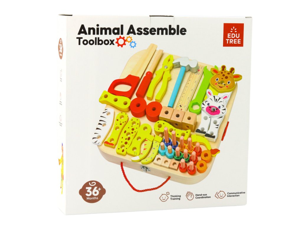 Súprava obsahuje kompletný set základných nástrojov, ako sú pílka, kladivo, skrutkovač, plochý kľúč, kliešte a pravítko, ako aj množstvo farebných montážnych prvkov – skrutky, matice a drevené bloky s otvormi, ktoré deti môžu voľne skrutkovať a spájať.