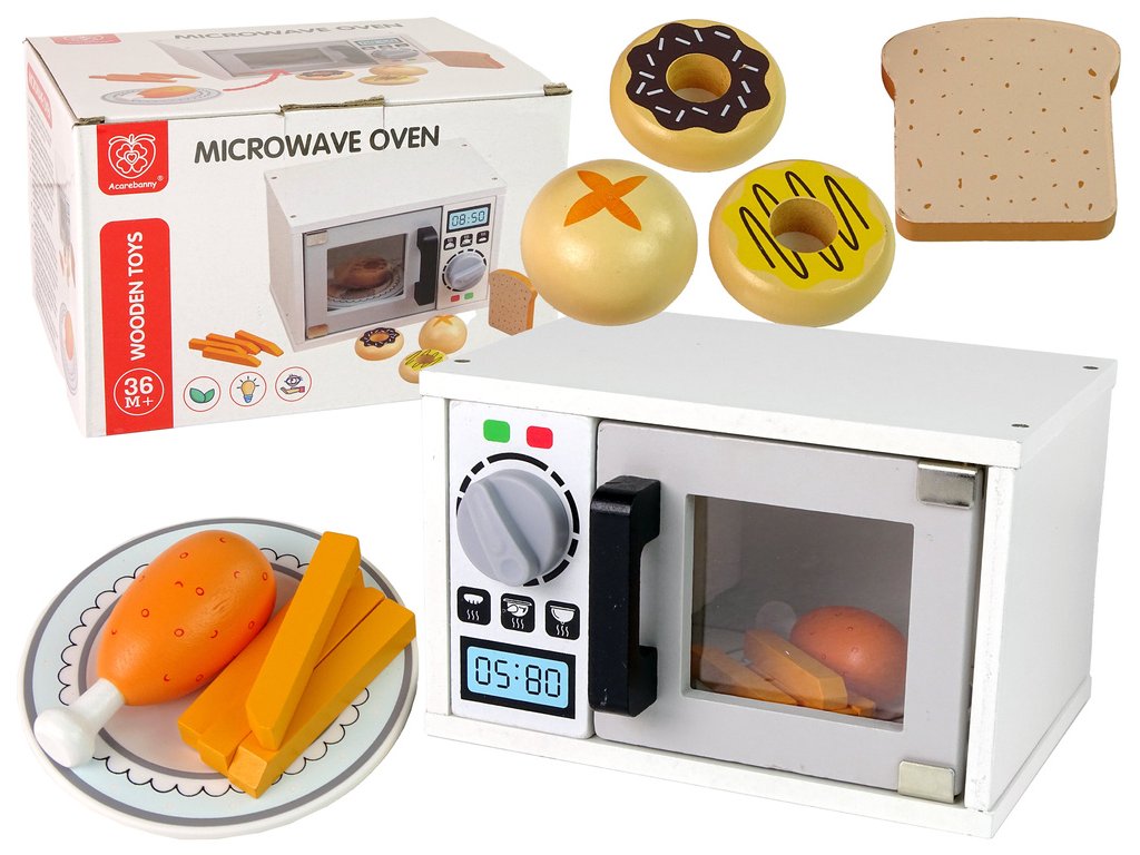 Drevená mikrovlnná rúra má otváracie dvierka a gombík. Keď ho otočíte, počujete cvaknutie. Priložené príslušenstvo vám umožní pripraviť jedlo; môžete uvariť večeru podľa postupu prípravy.