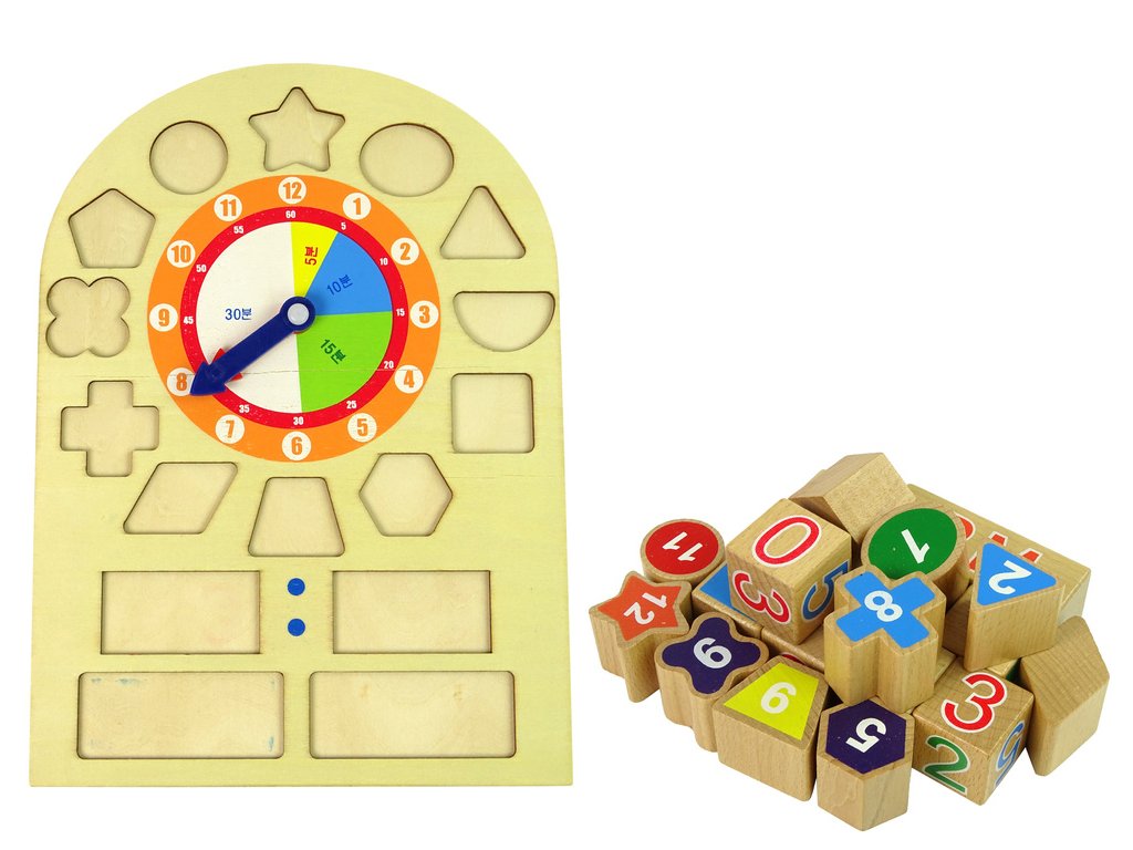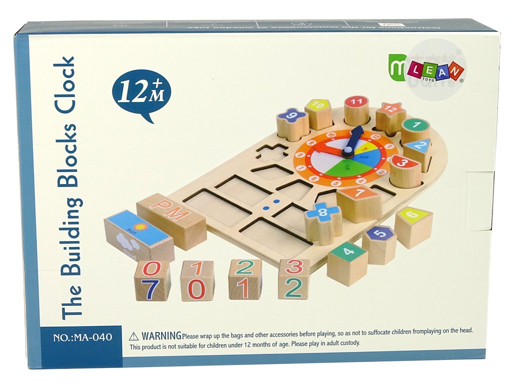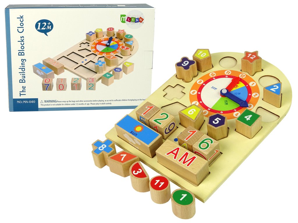 Vďaka blokom sa dieťa naučí tvary, čísla a farby. Sada obsahuje 12 blokov s číslami označujúcimi hodiny, z ktorých každý pasuje len do jedného z otvorov vo vzdelávacej kocke. Úlohou dieťaťa bude nájsť rovnaké tvary a umiestniť do nich všetky bloky ako triedič. Hodiny naučia vaše dieťa rozoznávať hodiny. Po prečítaní času nižšie môžu nastaviť čas pomocou 4 kociek s číslami. Dve dlhé kocky ukazujú čas dňa a počasie. Malé vzdelávacie hodiny pomôžu vašemu dieťaťu učiť sa.