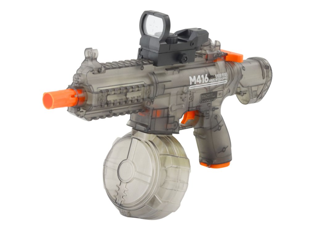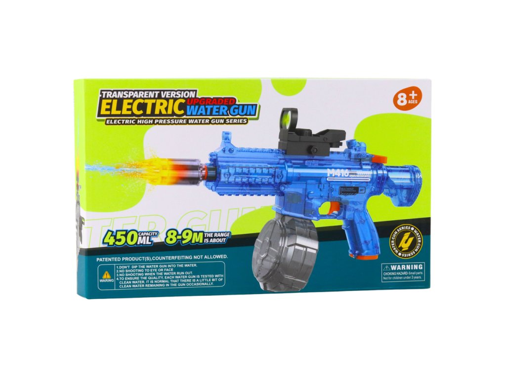 Elektrická vodná pištoľ M416 je moderná hračka, ktorá poskytuje intenzívnu a realistickú vodnú zábavu. Model má priehľadný dizajn, veľký zásobník s objemom až 450 ml vody a mieridlo, ktoré zvyšuje realizmus pri mierení. Pištoľ má svetelné efekty na hlavni, čo dodáva hre dynamiku a atraktívnosť.