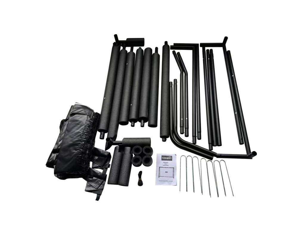 Robustný oceľový rám zaisťuje stabilitu počas hry aj pri silných nárazoch lopty. Elegantný čierny poťah rámu chráni konštrukciu pred poveternostnými vplyvmi a dodáva bránke moderný vzhľad.