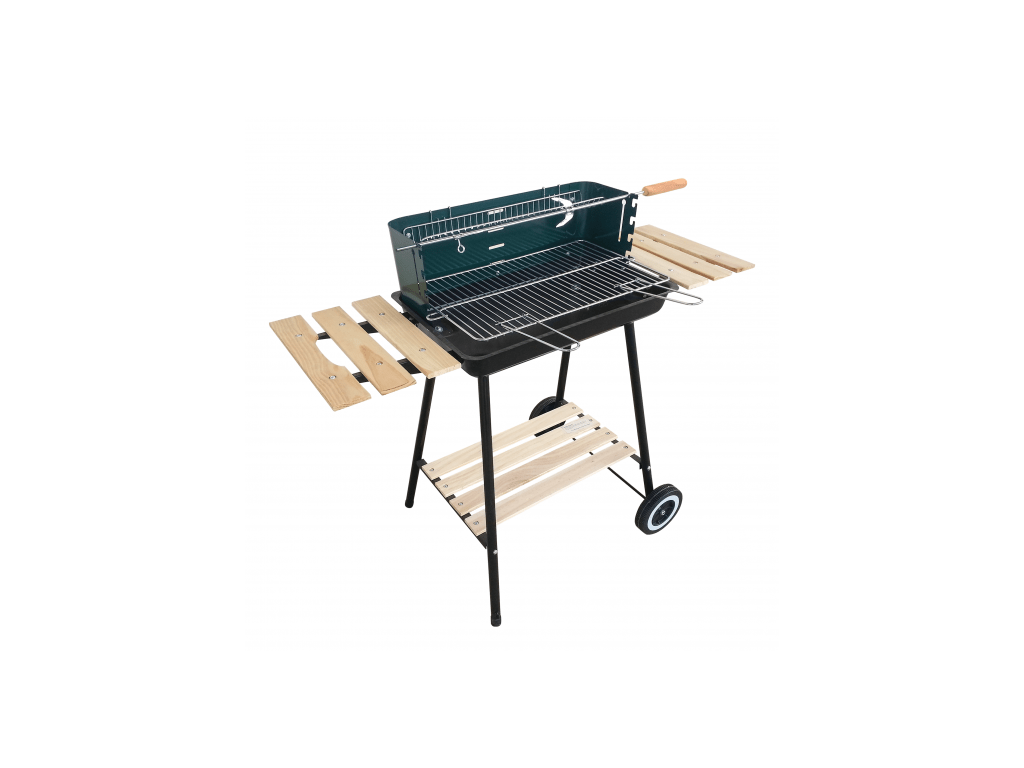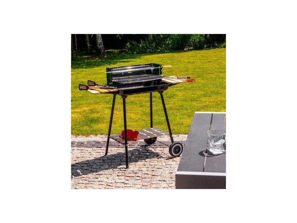| Príslušenstvo: | Ražň na kurča s drevenou rukoväťou, 2 drevené bočné police, drevená spodná polica, transportné kolieska |