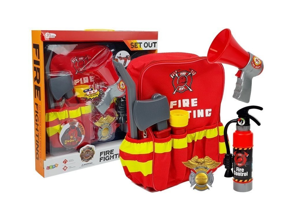 Hasičská súprava Batoh Svietidlo Hasiaci prístroj Megafón Príslušenstvo Červená