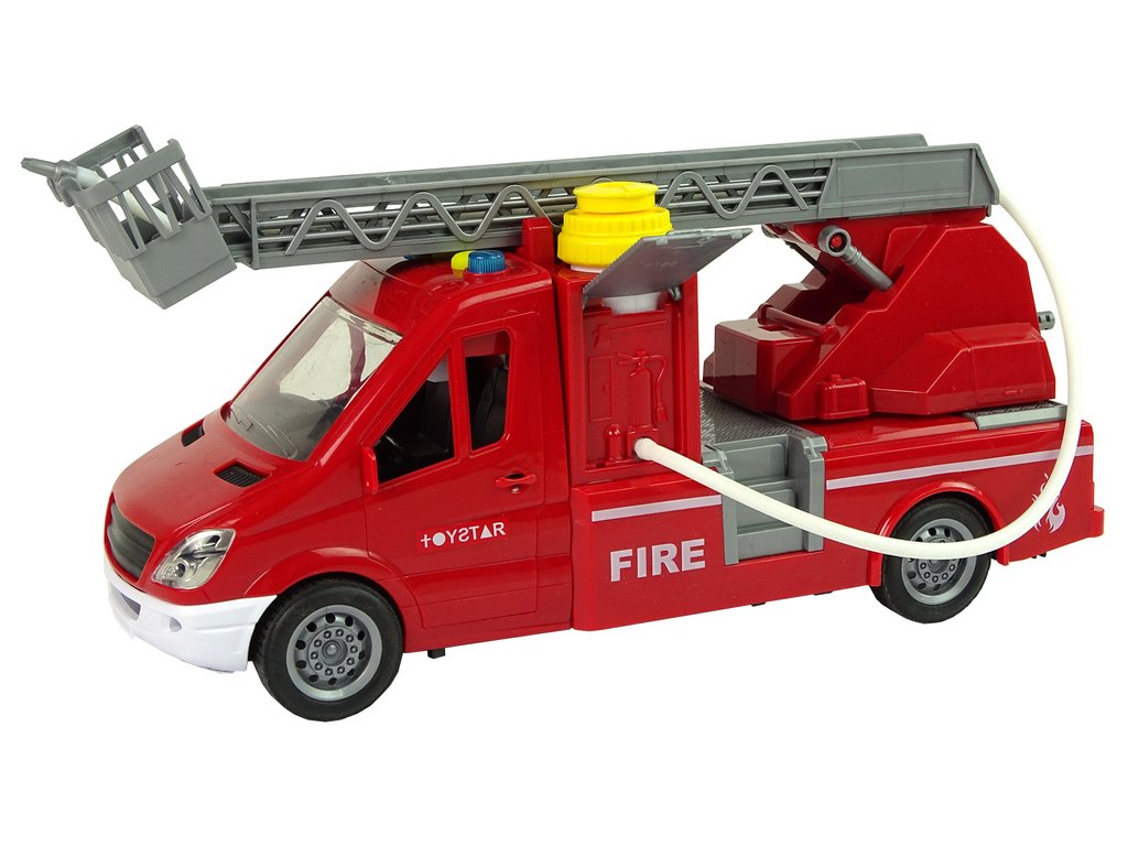 Auto má v hornej časti kabíny žltý otvor, cez ktorý sa dá ľahko naliať voda dovnútra. Stlačte ho niekoľkokrát a uvidíte, ako voda vyteká z hadice namontovanej na určenom mieste. Váš malý pomocník je pripravený na akciu! Stlačte tlačidlo na hornej časti nádrže a uvidíte, ako voda začne striekať! Môže uhasiť malé požiare. Rebrík sa zdvíha pomocou kľuky.