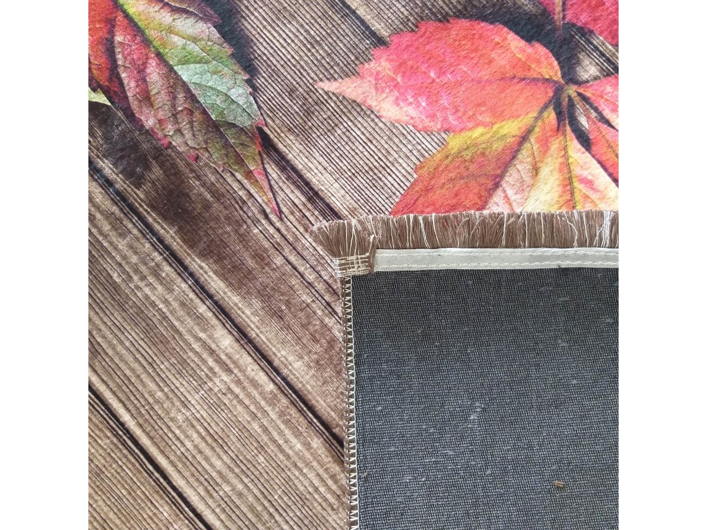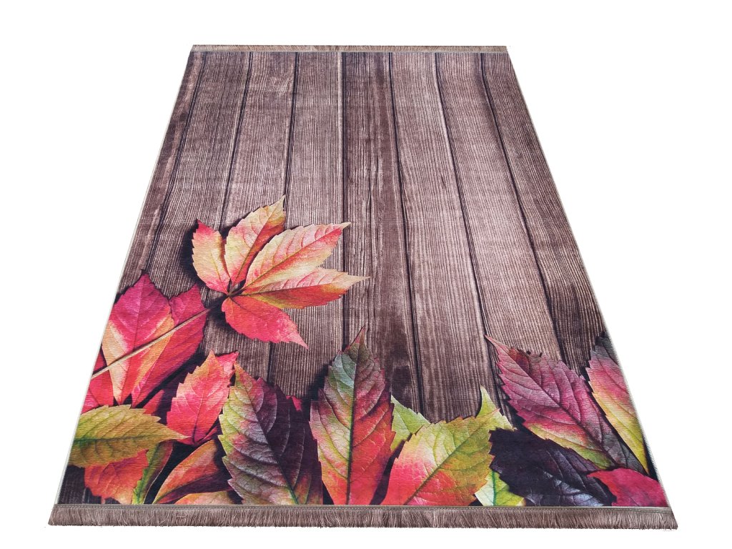 Hnedý koberec s motívom listov Horeca-New 106 je originálnym dizajnovým doplnkom, ktorý do interiéru vnáša prírodnú atmosféru a pocit tepla. Motív farebného lístia v kombinácii s podkladom imitujúcim drevené dosky vytvára harmonický a vizuálne zaujímavý celok, ktorý zaujme na prvý pohľad.