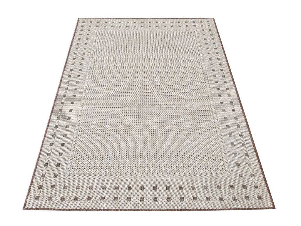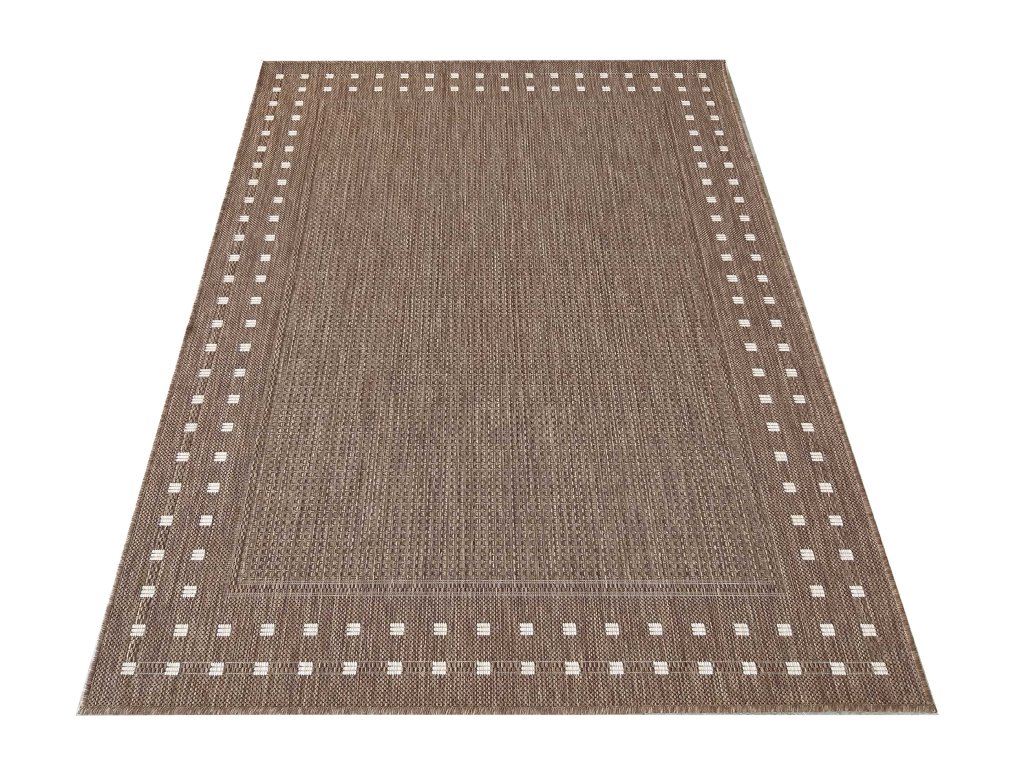 Plocho tkané prevedenie z kvalitného syntetického materiálu verne imituje vzhľad prírodných vlákien, pričom ponúka vyššiu odolnosť a jednoduchšiu údržbu. Koberec je navrhnutý tak, aby odolával opotrebovaniu, vlhkosti aj strate farby, vďaka čomu si dlhodobo zachováva svoj vzhľad.