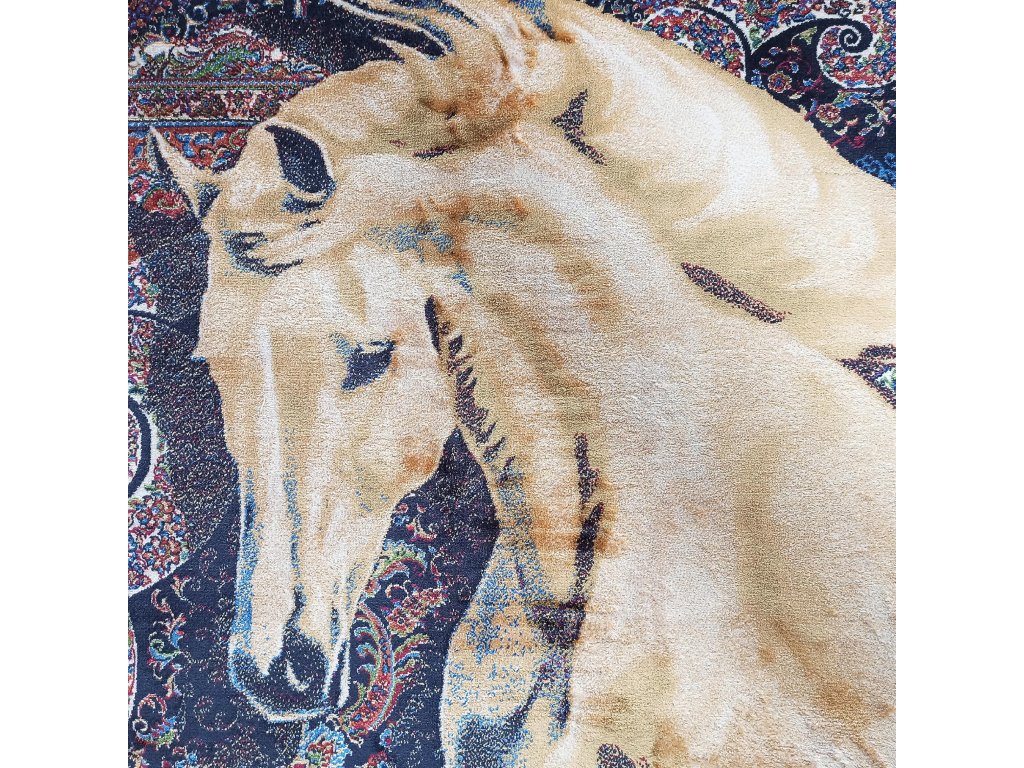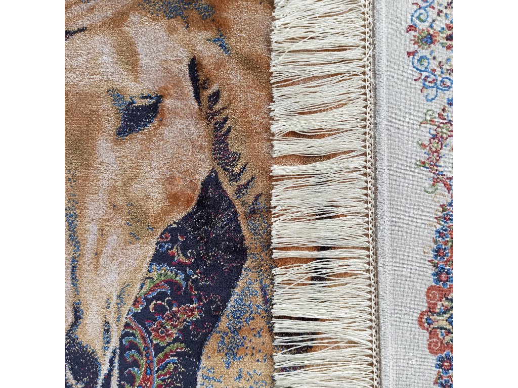 Hodvábny exkluzívny koberec Qum Silk 04 v modrej farbe je výnimočný umelecký kúsok, ktorý spája luxusné materiály, detailné remeselné spracovanie a výrazný orientálny motív. Dominantným prvkom koberca je dynamický motív koní, ktorý symbolizuje silu, eleganciu a slobodu, vďaka čomu sa stáva neprehliadnuteľnou dominantou každého interiéru. Bohaté zdobenie v odtieňoch modrej, bordovej a zlatej farby spolu s jemnými strapcami dodáva kobercu reprezentatívny a noblesný vzhľad.