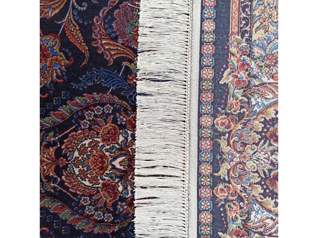 Hodvábny exkluzívny koberec Qum Silk 08 – modrá predstavuje harmonické spojenie luxusu, jemného lesku hodvábu a detailného orientálneho dizajnu. Precízne zdobený vzor v hlbokých modrých odtieňoch s krémovými a zlatými akcentmi pôsobí elegantne a nadčasovo, čím dokáže povýšiť každý interiér na reprezentatívnu úroveň. Dekoratívne strapce dodávajú kobercu noblesný vzhľad a podčiarkujú jeho umelecký charakter.