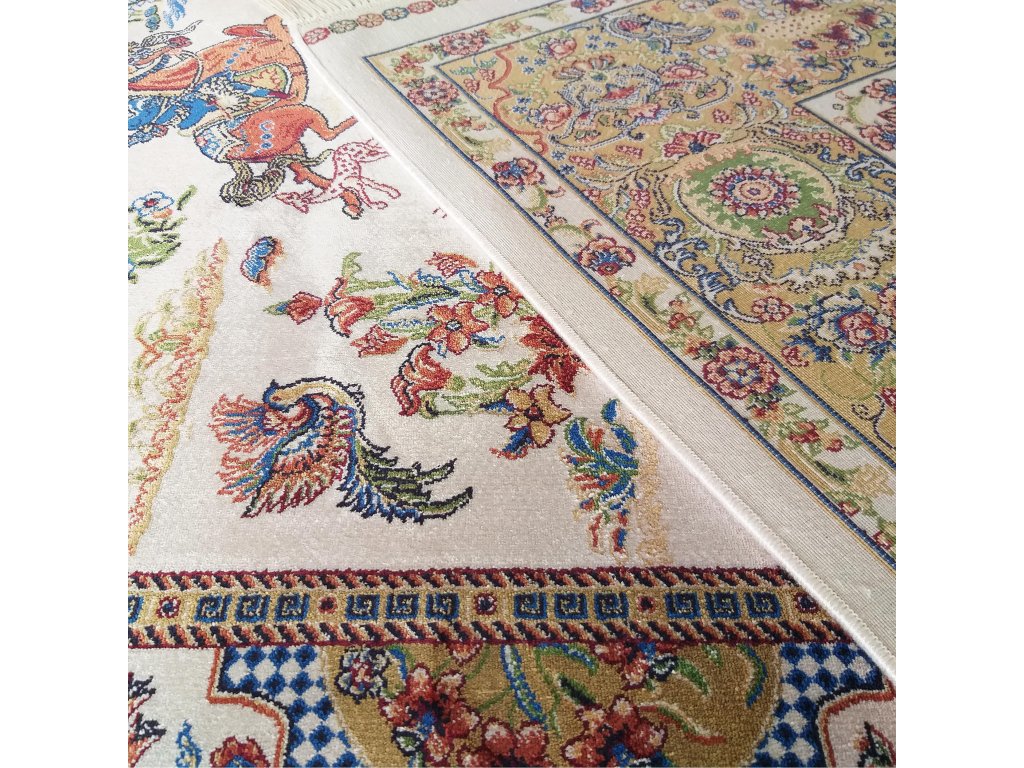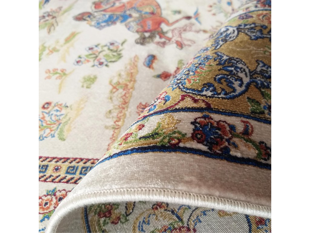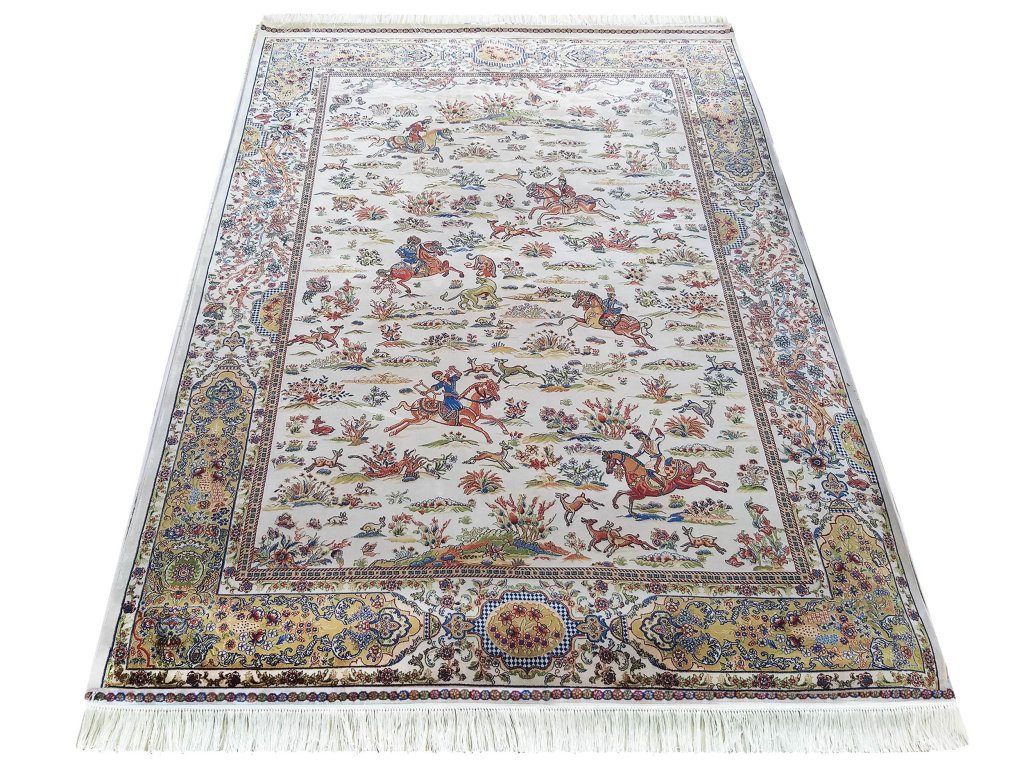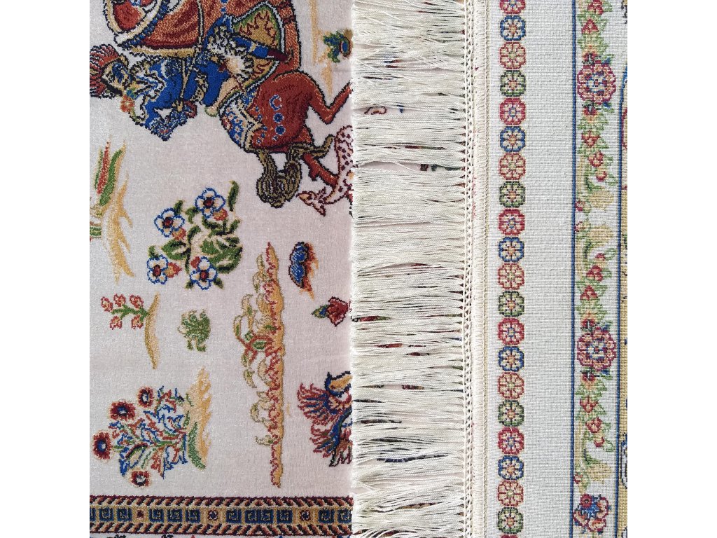 Hodvábny exkluzívny koberec Qum Silk 10 v krémovej farbe je výnimočné umelecké dielo, ktoré prináša do interiéru luxus, jemnosť a precízne orientálne spracovanie. Dominantným prvkom koberca je detailná scénická kompozícia s jazdcami na koňoch a prírodnými motívmi, ktorá pôsobí ako tkaný obraz. Svetlé krémové pozadie v kombinácii s jemnými farebnými detailmi a bohatým ornamentálnym lemovaním vytvára elegantný a reprezentatívny vzhľad. Dekoratívne strapce podčiarkujú jeho exkluzivitu.