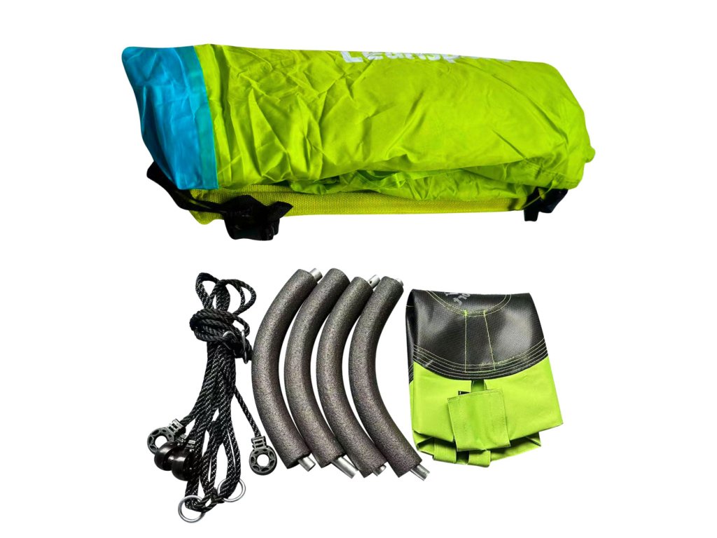 Stan má obojstranný vchod, roletové závesy na suchý zips a sieťované okná po bokoch pre vetranie a viditeľnosť. Je vyrobený z odolného polyesteru odolného voči poveternostným vplyvom. Jeho intenzívna zelená farba je pútavá a zdôrazňuje jeho moderný dizajn.