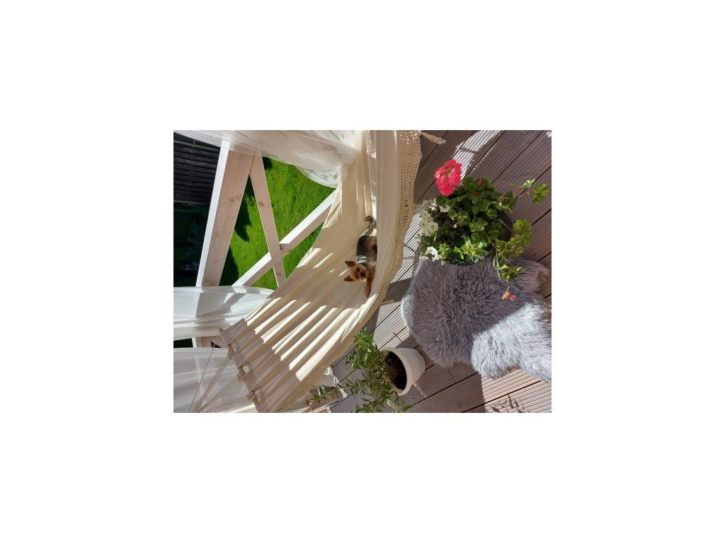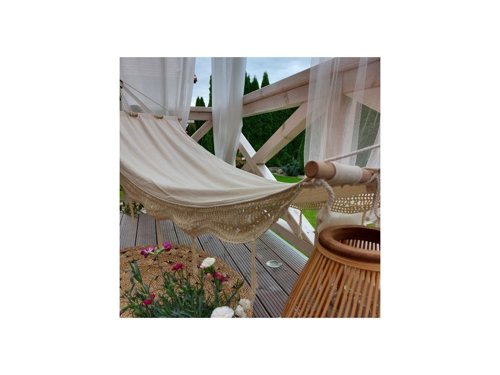 Módna záhradná hojdačka s rozmermi 200 x 80 cm v štýle boho je skvelým doplnkom do záhrady a na terasu. Ozdobná čipka dodáva štýl a hojdačka bude skvelou dekoráciou domácej oddychovej zóny. Hojdačka je vyrobená z bavlny, ktorá je veľmi príjemná na dotyk a zaisťuje vyšší komfort oddychu. Pevné laná v kombinácii s nosnými trámami zaisťujú správne upevnenie hojdačky. Kombinácia kvality a elegantného vzhľadu zaručuje, že hojdačka vydrží niekoľko sezón.