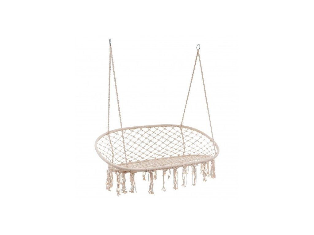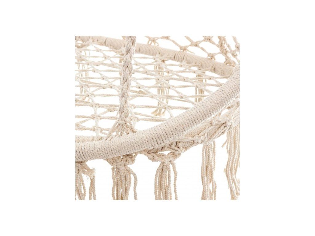 Veľké závesné kreslo v štýle boho určené pre 2 osoby je zaujímavým návrhom na zariadenie záhrady, terasy a balkóna. Sedadlo umožňuje spoločný oddych na čerstvom vzduchu. Pletené z bavlnených lán poskytuje komfort a zároveň je pevné. Vysoké operadlo a veľká plocha sedadla umožňujú relaxáciu v akejkoľvek polohe. Celok je upevnený k stropu pomocou 4 pevných lán s 2 kovovými úchytmi. Vďaka použitým materiálom bude nábytok slúžiť dlhšie.