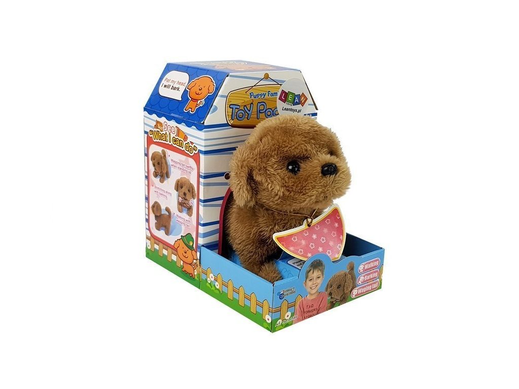 Hnedý, chundelatý psík s veľkými očami a roztomilou mašľou je taký roztomilý, že od neho nemožno odtrhnúť oči. Psík chodí a vrtí chvostíkom. Keď ho pohladíte po hlave, vydáva zvuky a pretiahne sa, správajúc sa ako šťastný psík. Otvára aj papuľku a vydáva zvuky. Môžete vziať svojho malého plyšového priateľa na prechádzku a sledovať, ako veselo vrtí chvostíkom.
