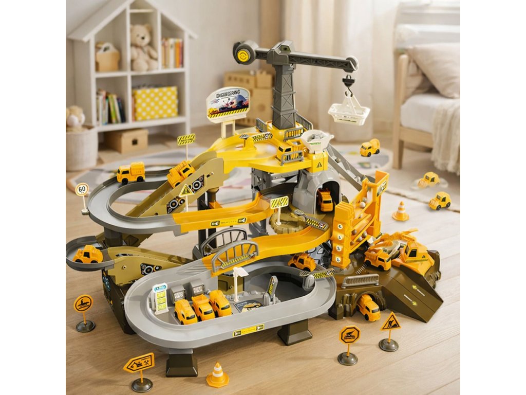 Interaktívne banský parkovisko je rozsiahla sada hračiek, ktorá prenesie deti do sveta baní, stavebných strojov a realistických technických scenárov. Súprava bola navrhnutá pre dynamickú a kreatívnu hru, kombinujúcu prvky pohybu, zvuku a elektrickej mechaniky. Vďaka viacúrovňovej konštrukcii, koľajniciam, rampám, žeriavu a automatickému systému na stúpanie vozidiel si deti môžu vytvárať vlastné prepracované príbehy a herné scenáre.