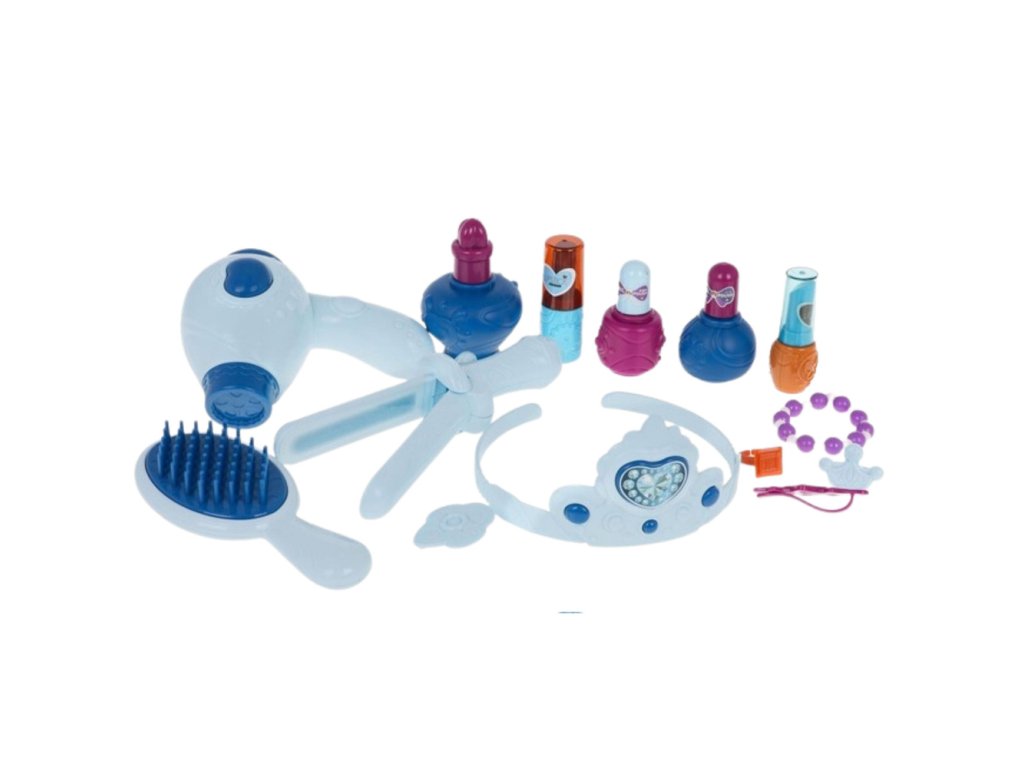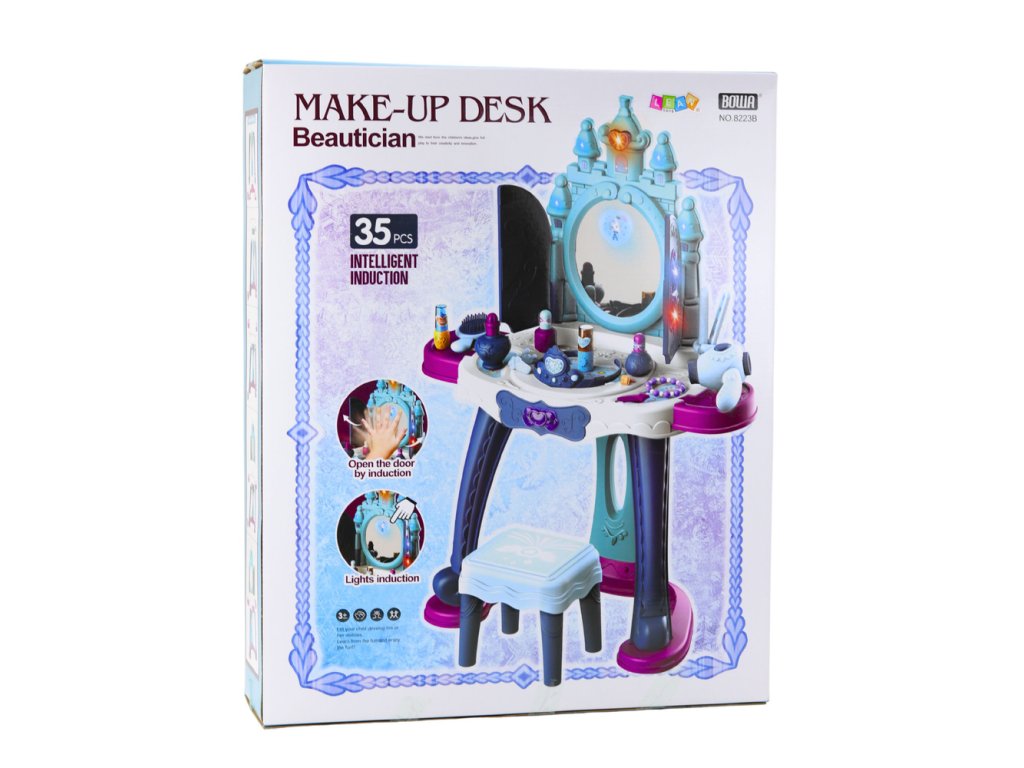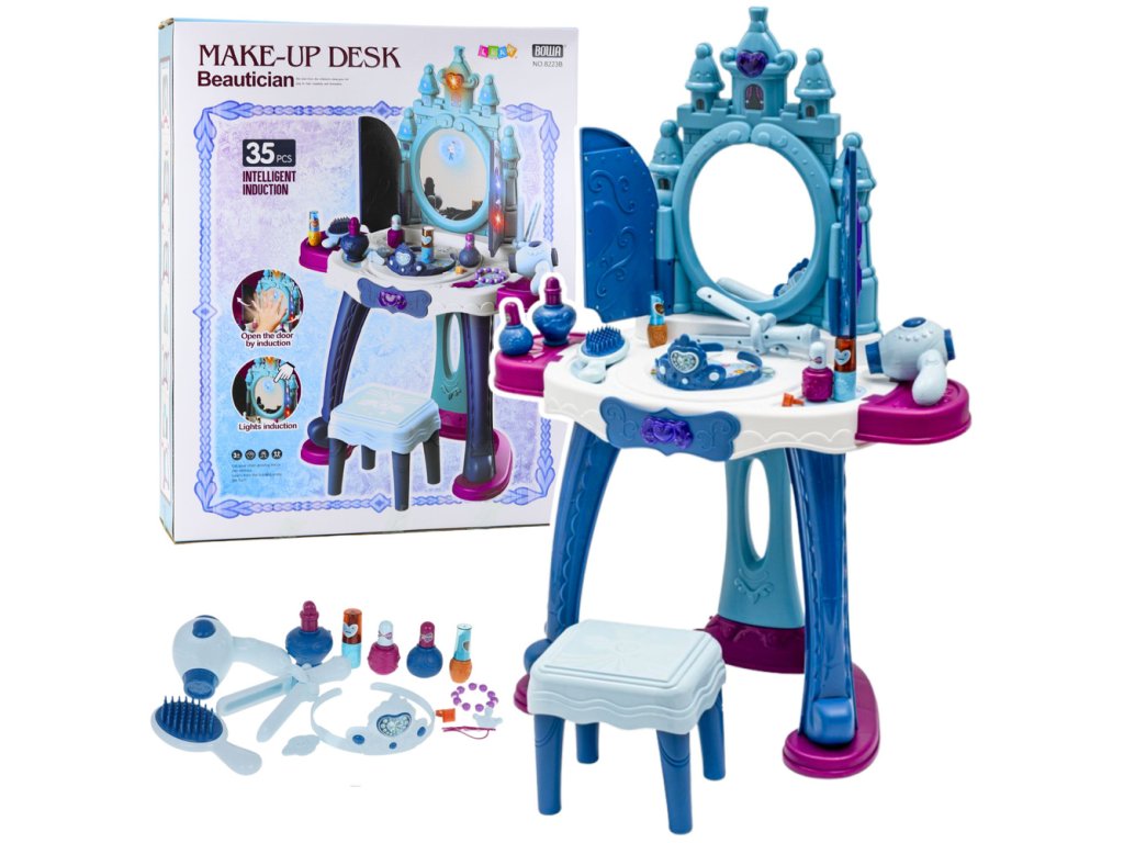 Svetlá umiestnené v hornej časti, po bokoch zrkadla a na dvierkach jemne osvetľujú celú konštrukciu a vytvárajú atmosféru skutočného kráľovského budoáru. Zvukové efekty v podobe čarovných melódií, ktoré sa aktivujú pri otvorení dvierok, podnecujú hru a stimulujú fantáziu. Stabilná stolička umožňuje dieťaťu pohodlne sedieť pri toaletnom stolíku a využívať všetky jeho funkcie, zatiaľ čo početné príslušenstvo – fén, kefa, šperky a kozmetická sada – umožňuje nespočetné možnosti stylingu a hru v skutočnom kozmetickom salóne.