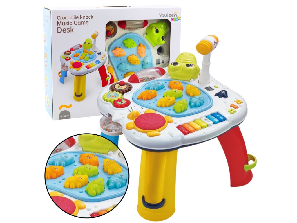 Hračka má sedem klávesov, ktoré deťom umožňujú hrať jednoduché melódie a vydávať zvuky zvierat, čím stimuluje ich zvedavosť a rozvíja sluchové vnímanie. Centrálnym prvkom stola je kladivková hra, v ktorej dieťa udiera na farebné postavičky a aktivuje zvukové a svetelné efekty. Vďaka tejto funkcii dieťa zlepšuje koordináciu rúk a očí a učí sa presnosti pohybov.