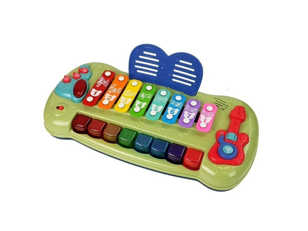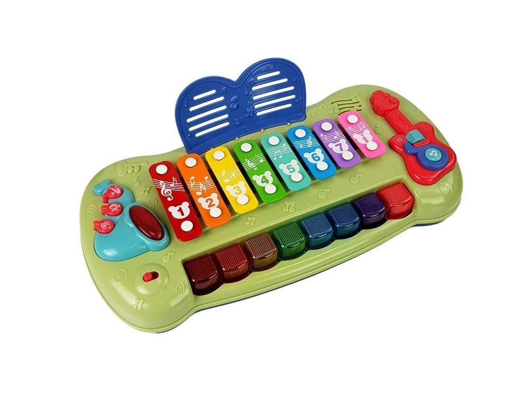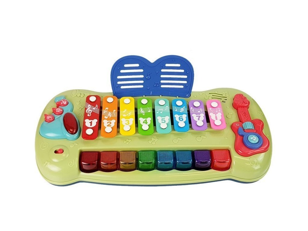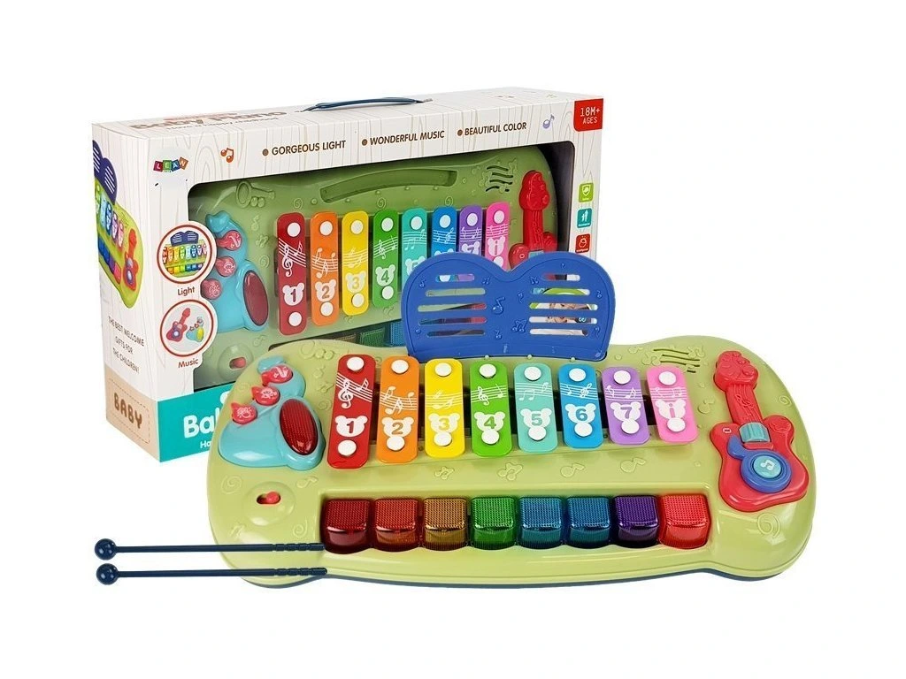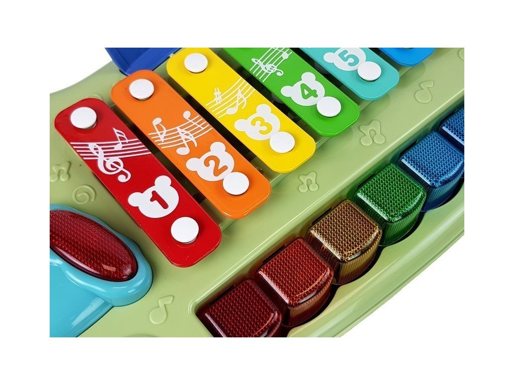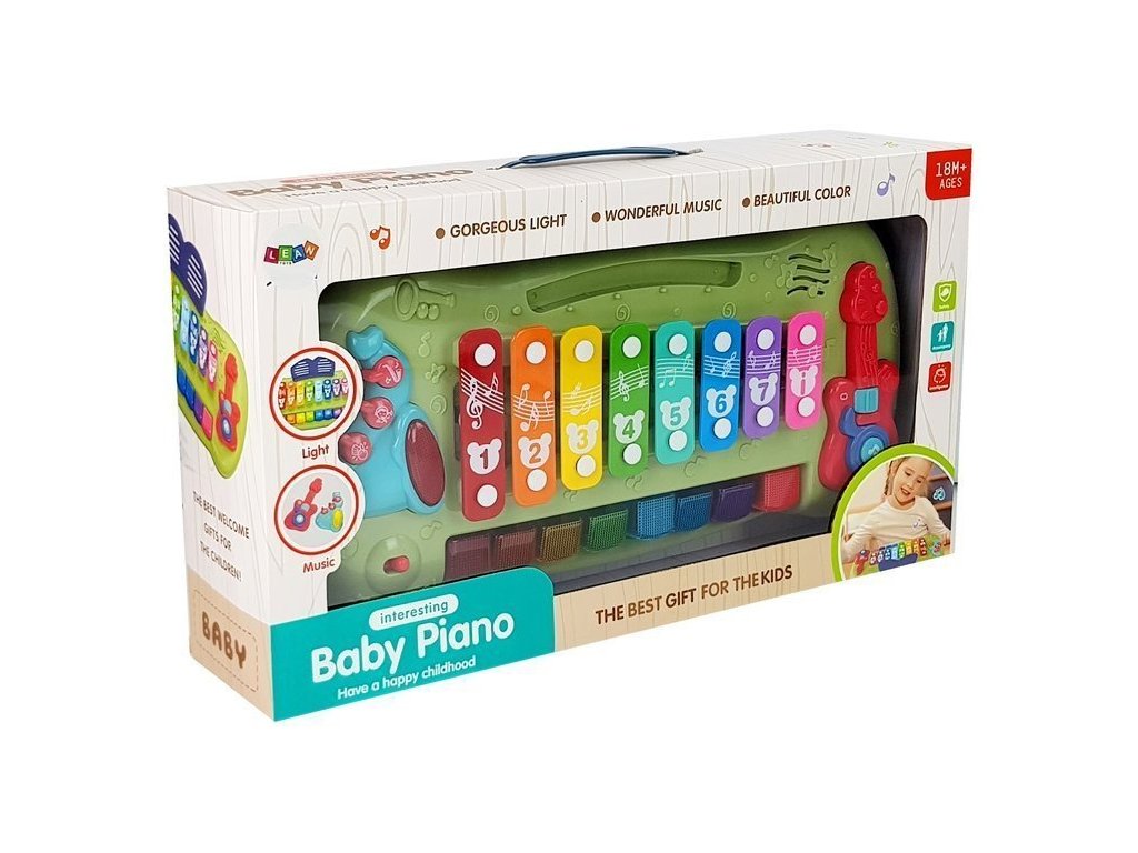 Živé farby a rôzne veľkosti stimulujú zmysel zraku a prinášajú radosť z účinkov novej hračky. Xylofón má 8 tónov, ktoré dieťa môže udierať paličkami alebo stláčať klávesy, rovnako ako na klavíri. Hračka vydáva príjemný zvuk, ktorý stimuluje zmysel sluchu. Rôzne tóny sú reprezentované rôznymi farbami a číslami, takže si vaše dieťa ľahko zapamätá hrané melódie a naučí sa rozpoznávať farby a svoje prvé čísla. Pri hraní melódie sa klávesy rozsvietia, čím naznačujú, ktoré zvuky sa používajú pre danú melódiu.