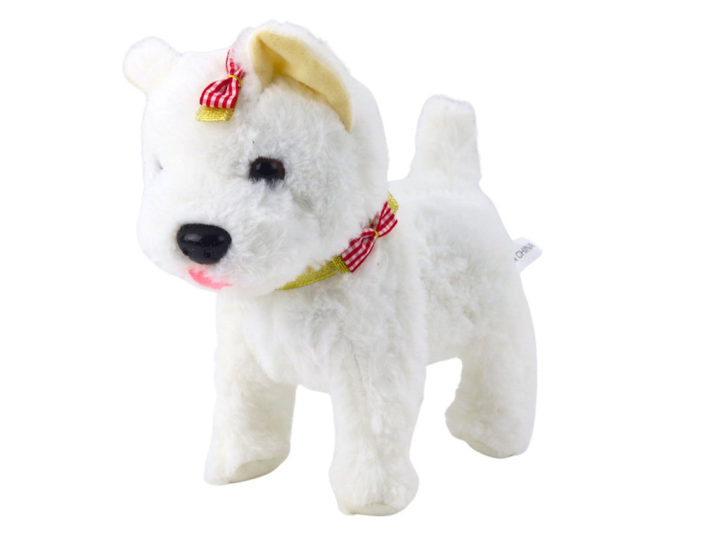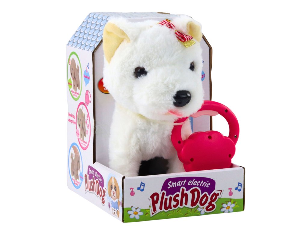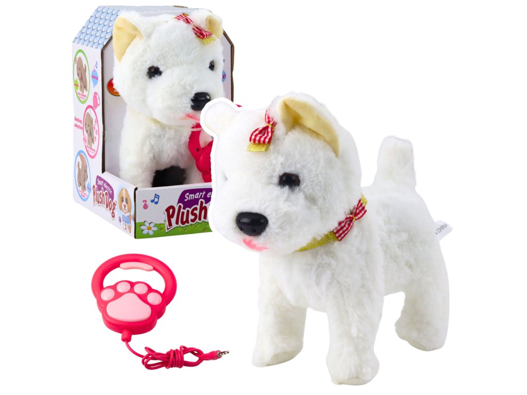 Interaktívny pes s mašľami na vodítku chodí šteká biely